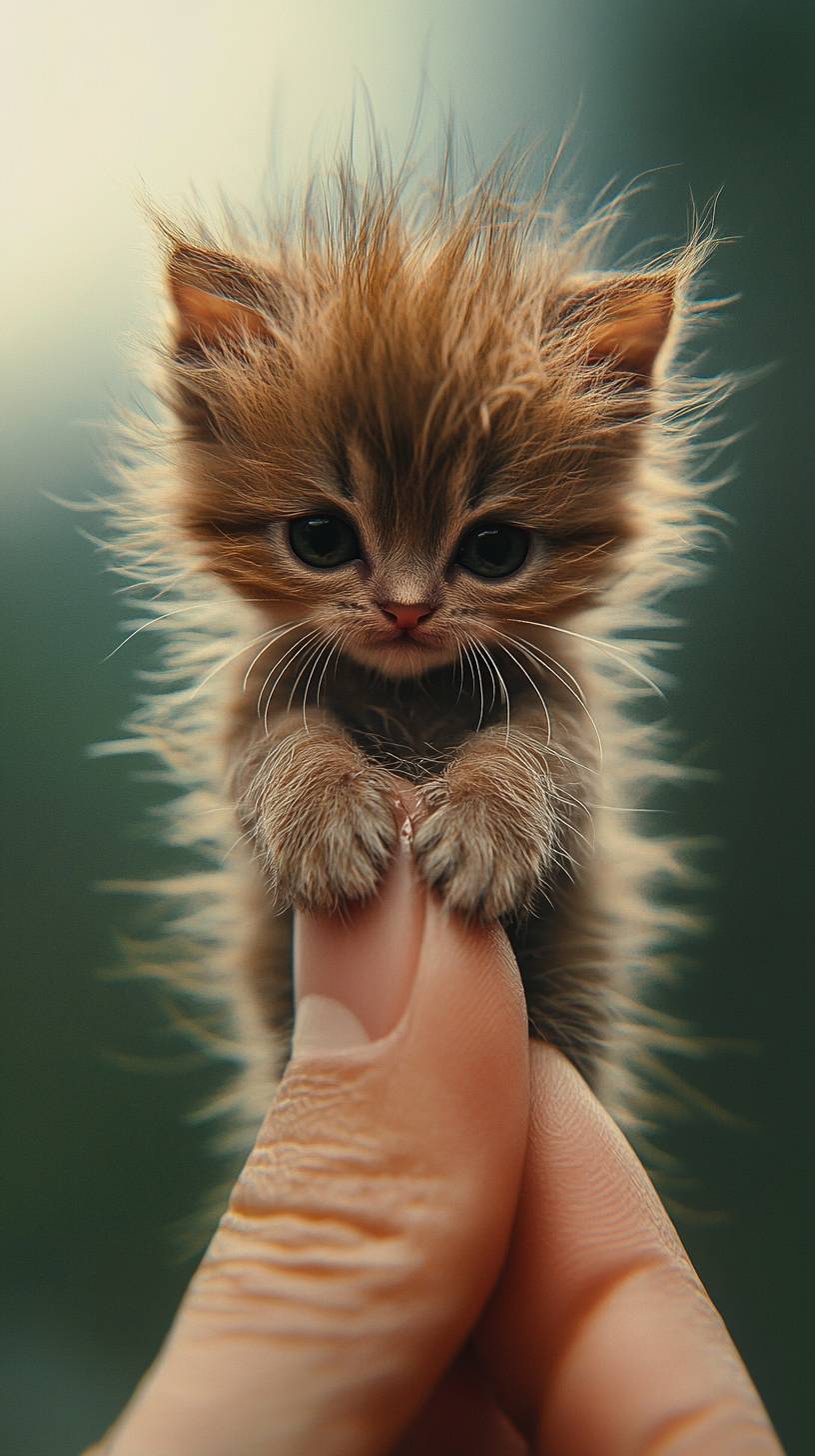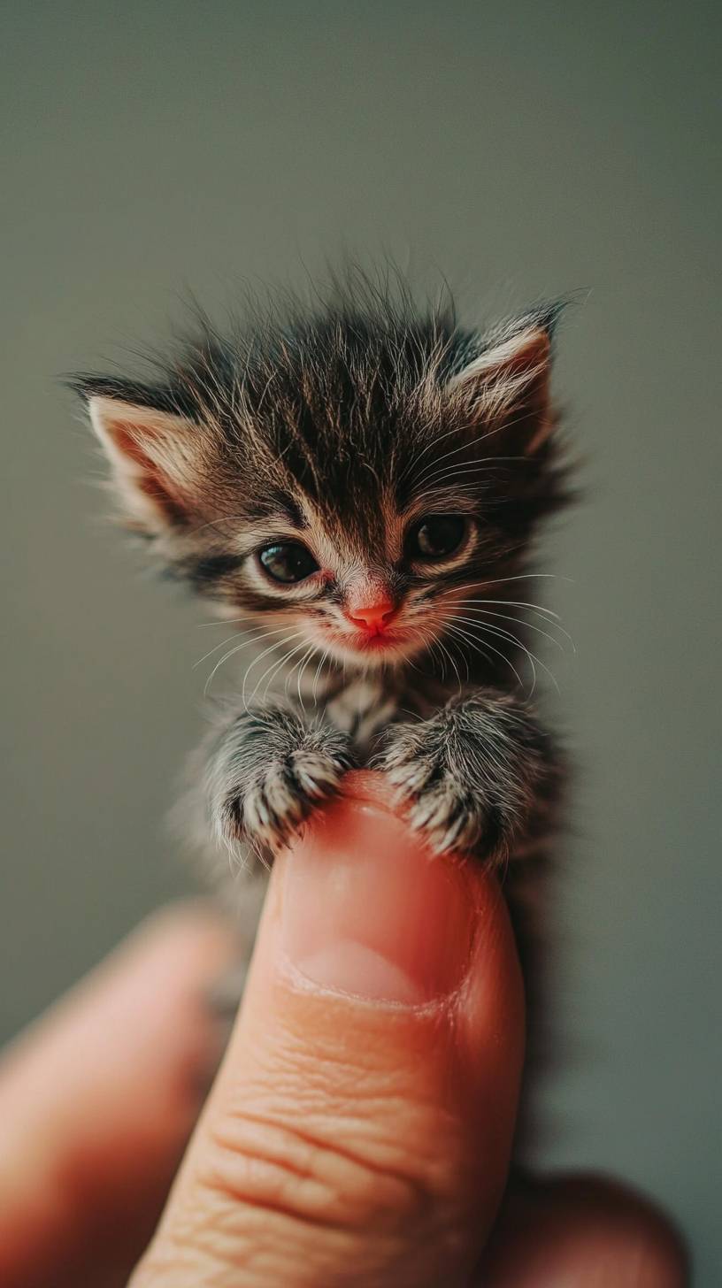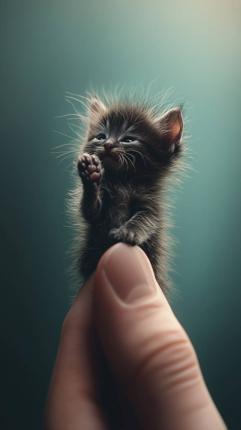 Photorealistic, 8k, A micro baby (cute cat) perched on a human finger,Messy hair --ar 9:16 --v 6.1
