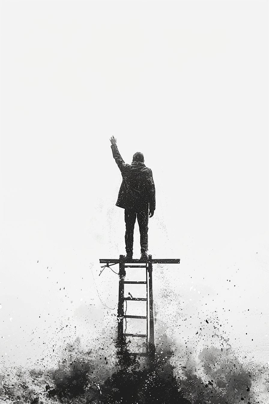 一幅簡約的圖像,顯示一個人站在梯子的頂端,一隻手舉起,從後面拍攝,畫面拉遠以顯示整架梯子,白色圖像。