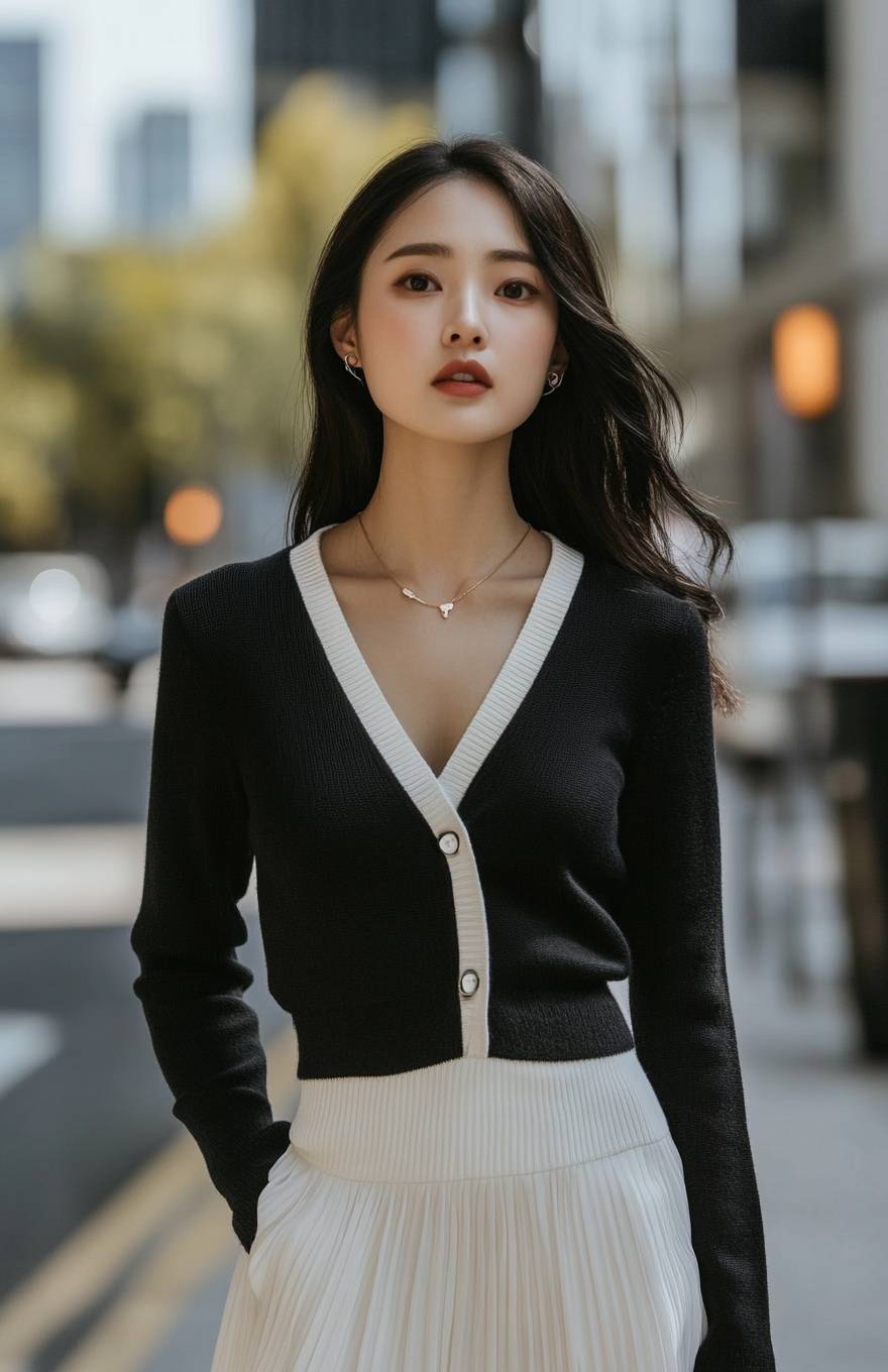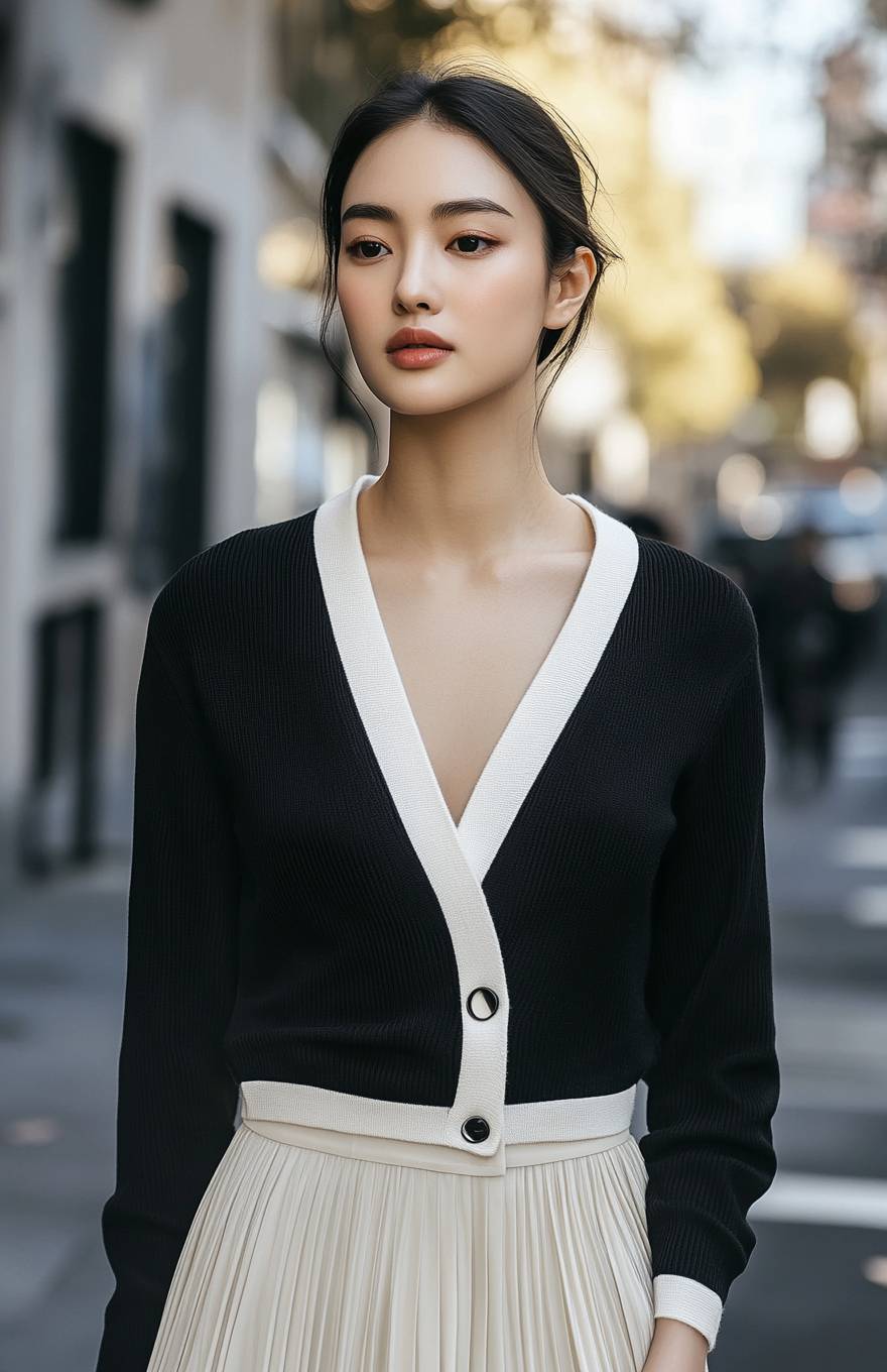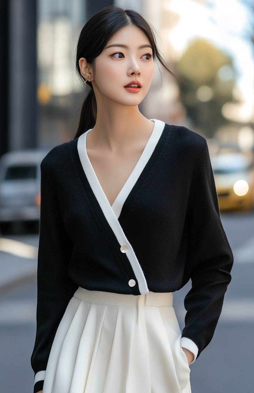 黑色V領針織開衫,配以白色對比修邊,搭配象牙色裙子,顯得優雅。一位三十多歲的韓國女性在街上走著,穿著這件衣服。時尚攝影,展示了這款毛衣的現代風格和流線型設計,體現現代攝影師的風格。