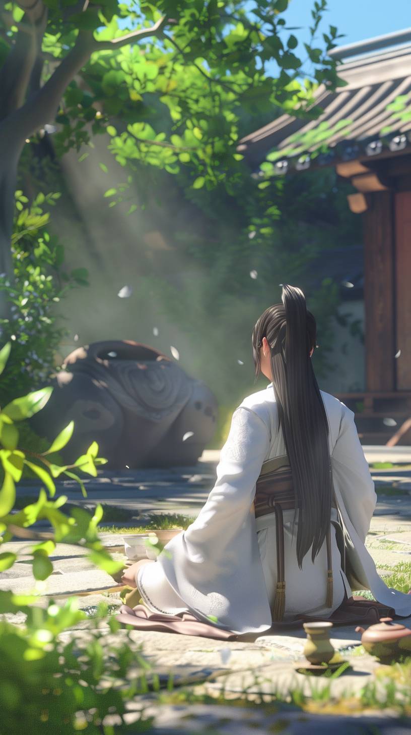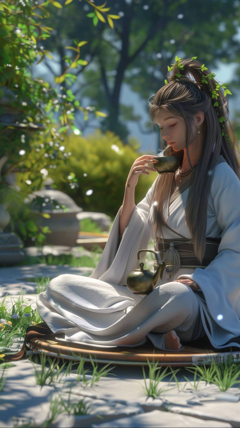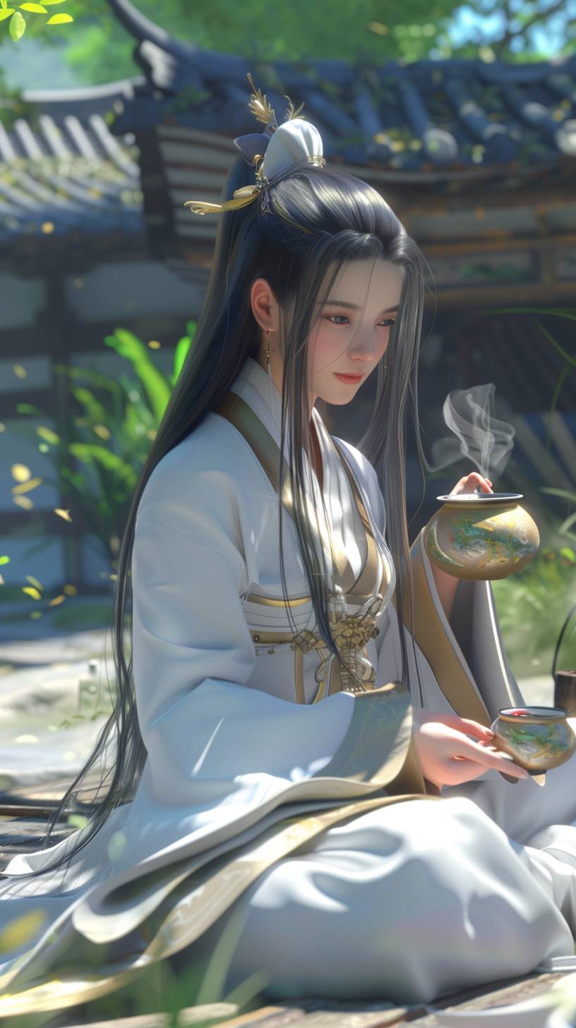 Shiori is sipping tea in a traditional garden. --ar 9:16 --sref 27 --v 6.0