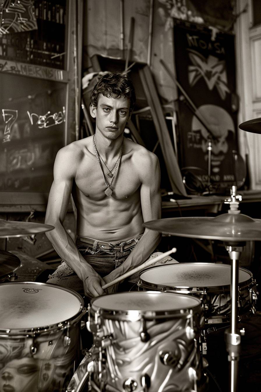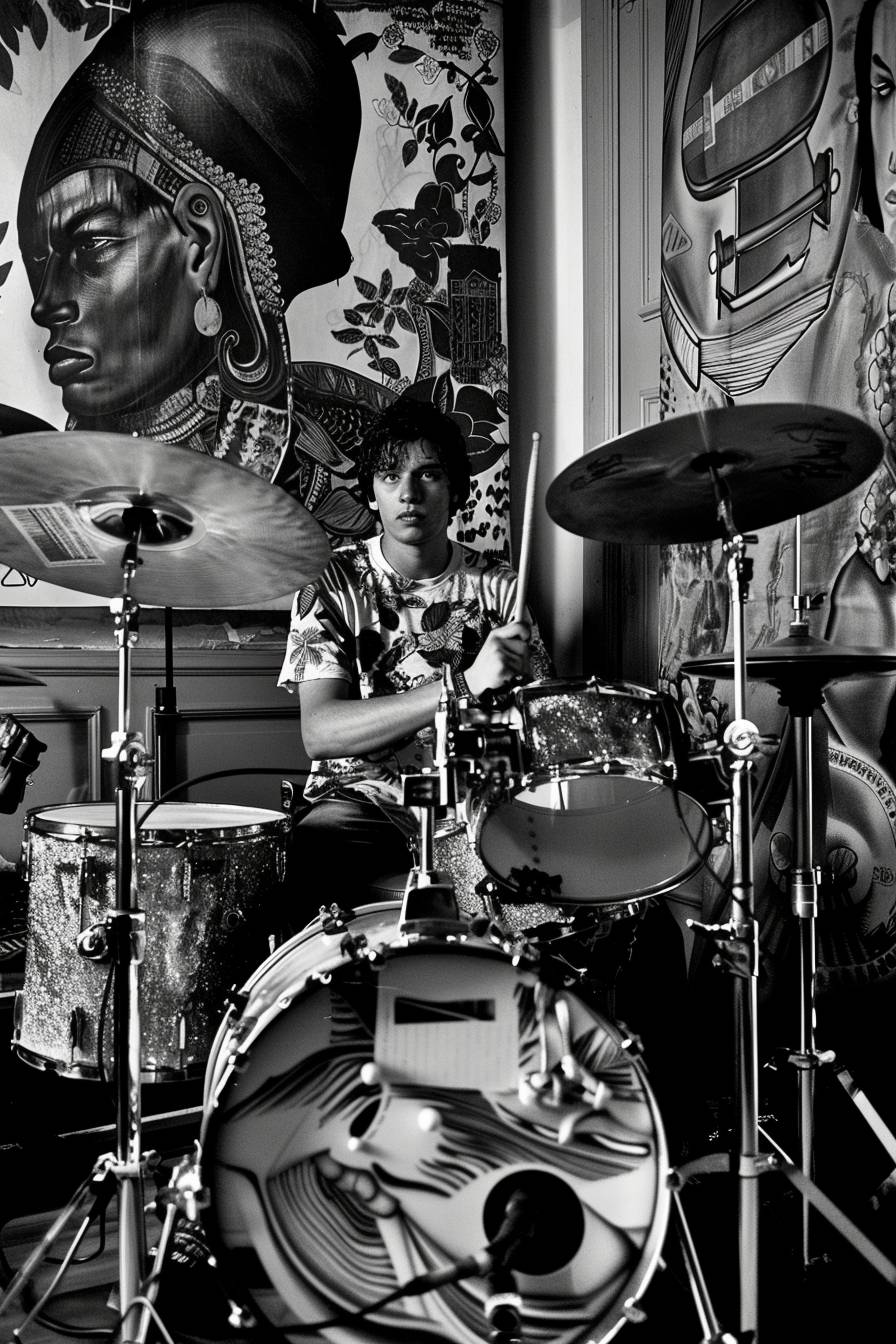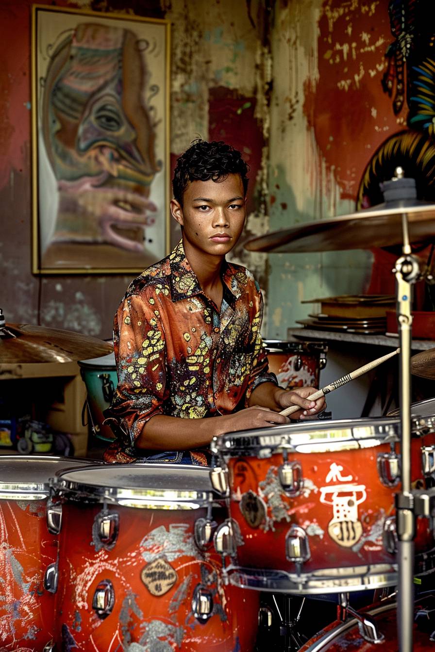 Toru is playing the drums in a garage. --ar 2:3 --sref 50 --v 6.0