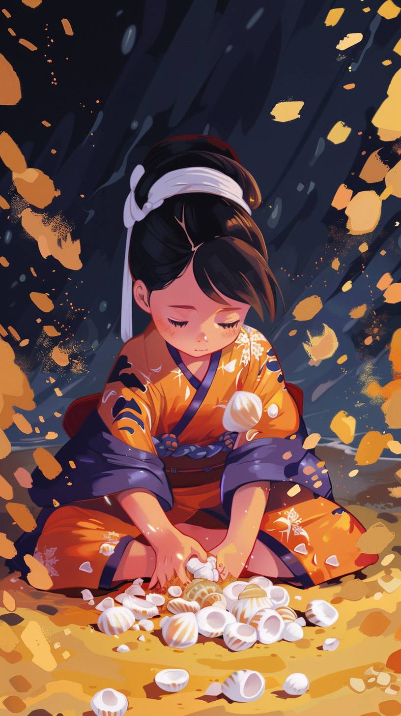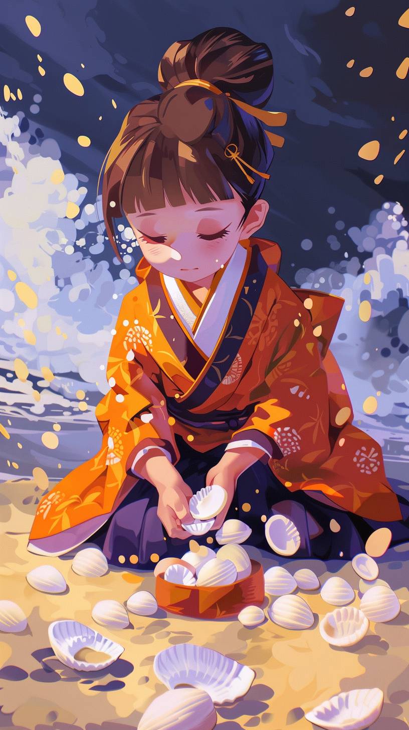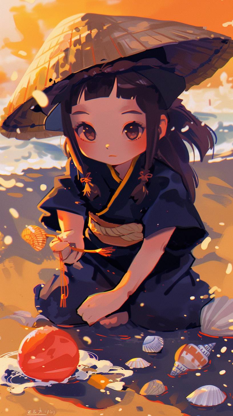 Mai is collecting seashells on the shore. --ar 9:16 --sref 79 --v 6.0