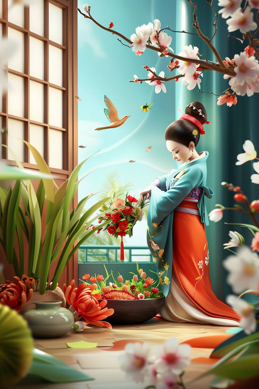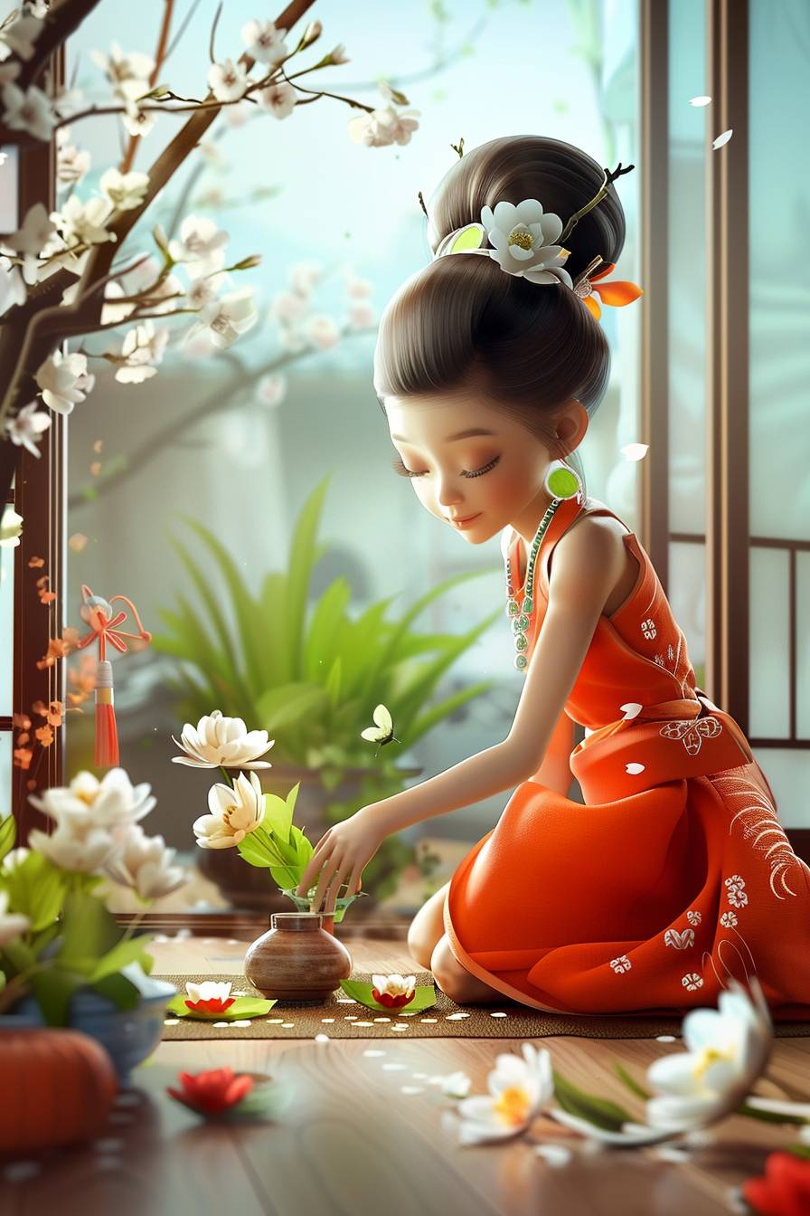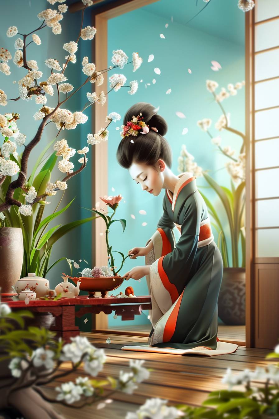 Sakura is arranging flowers in a traditional room. --ar 2:3 --sref 139 --v 6.0