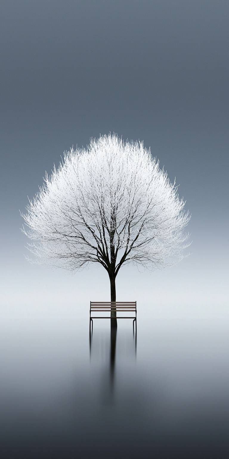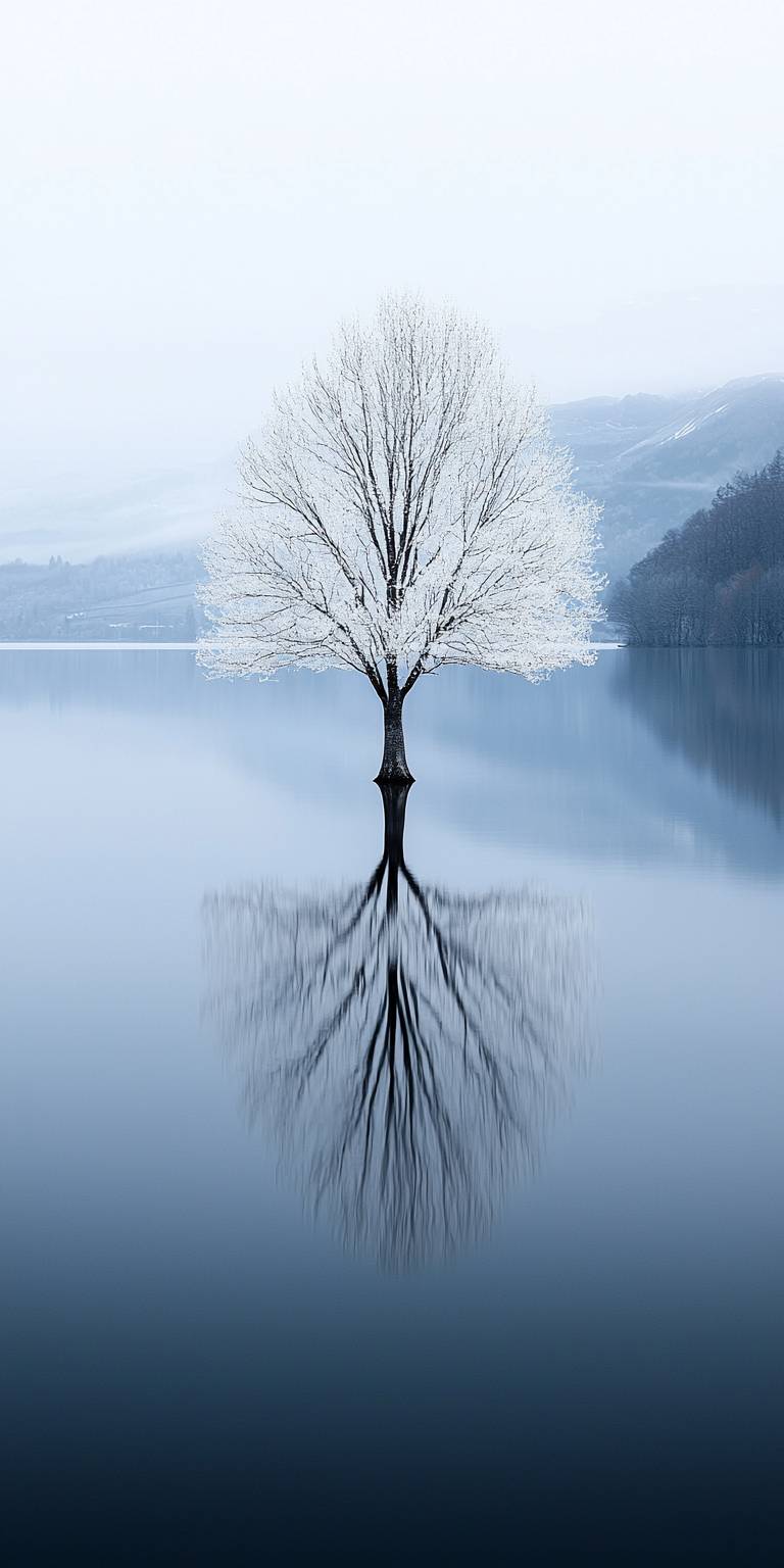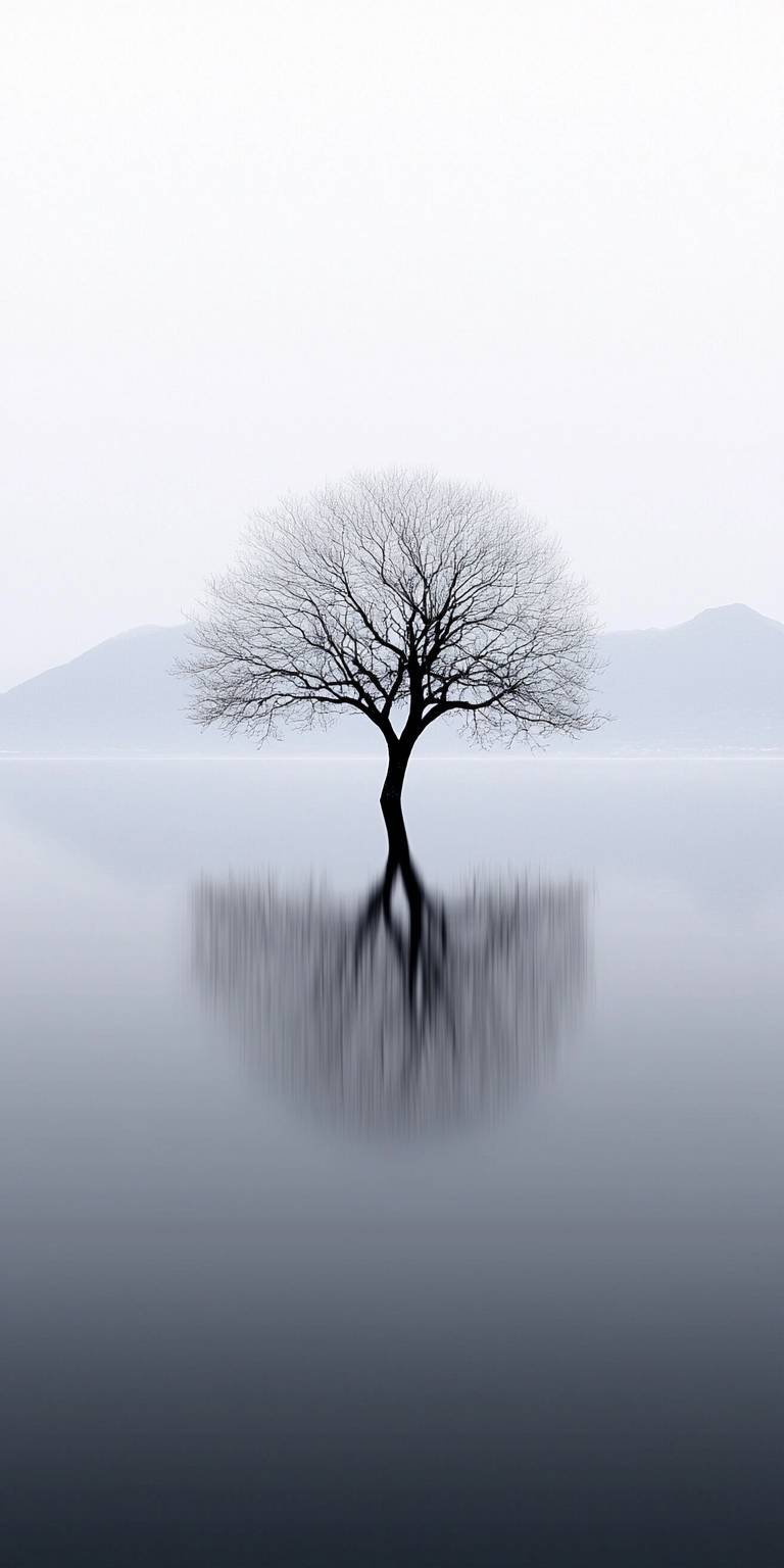 A minimalist’s dream, a white tree sits in a sea of nothingness, its waters inviting and the only source of color in this monochromatic landscape.32KUHD --ar 1:2 --quality 2 --style raw --personalize 1khlp1t --stylize 500 --v 6.1