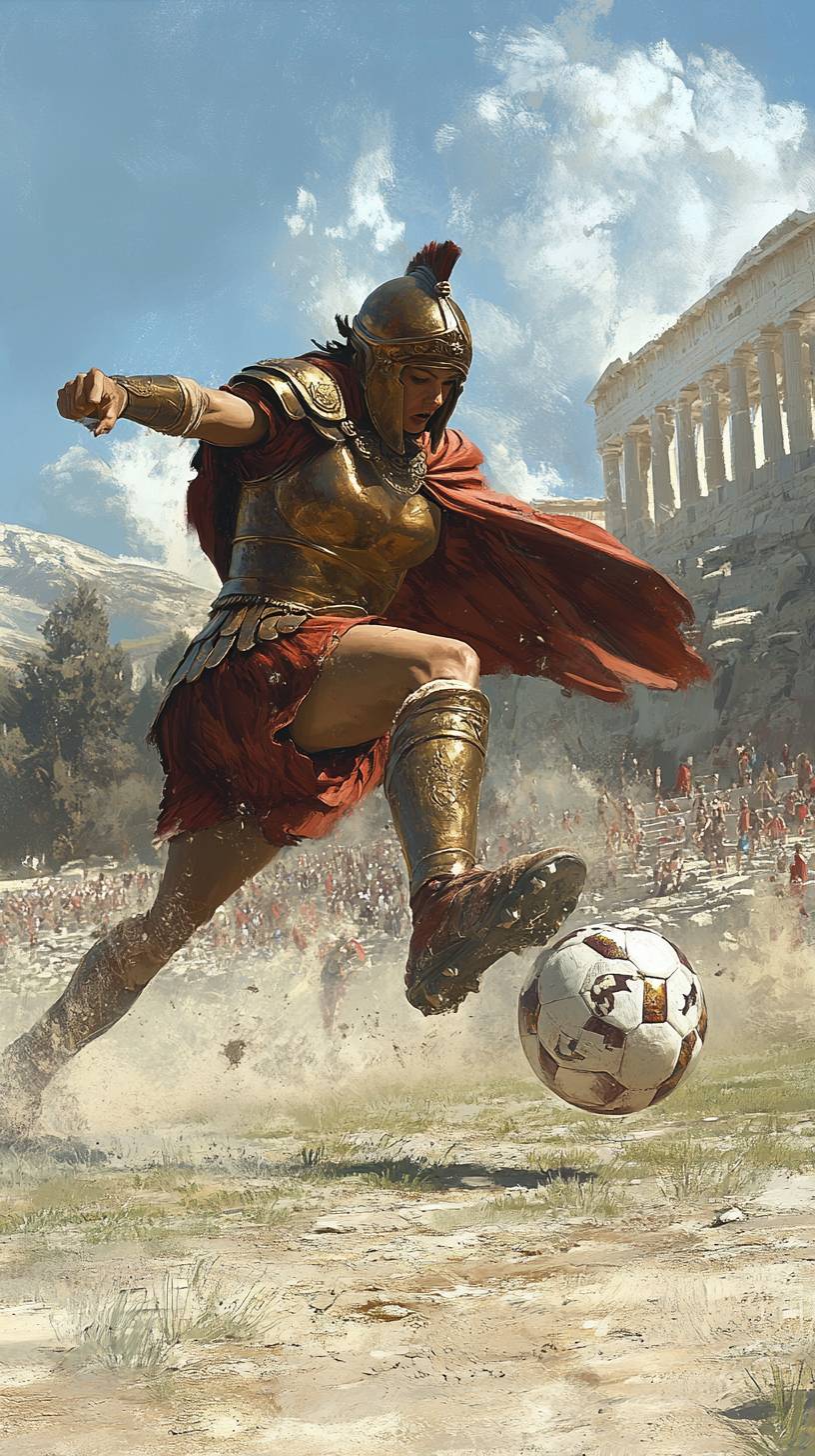 一位女性斯巴達戰士身著青銅盔甲和深紅色披風,正在古斯巴達的塵土飛揚的足球場上,奮力摔倒對手。她的鞋子類似於傳統的希臘克雷皮斯涼鞋,配有皮革帶和斯巴達圖案,提供了良好的抓地力和穩定性。足球是一個粗糙的皮革球,裝飾有類似斯巴達盾牌和戰鬥徽章的圖案。背景展示了崎嶇的風景和標誌性的希臘建築,如阿爾忒彌斯神廟,強調了斯巴達文化的力量和紀律。藝術風格是古典的,受到希臘陶器和雕塑的啟發,突顯了戰士的身體能力和運動的激烈。