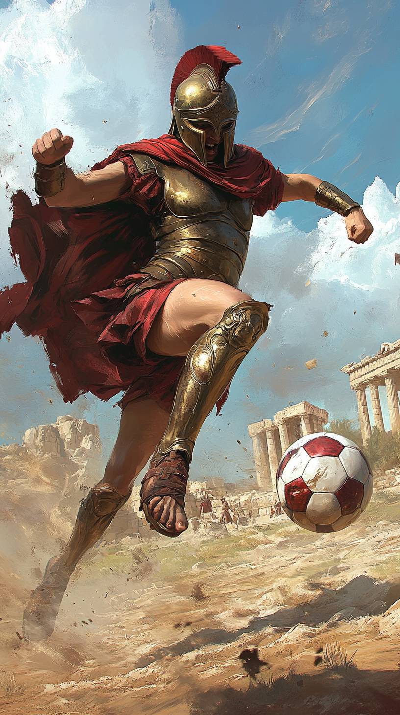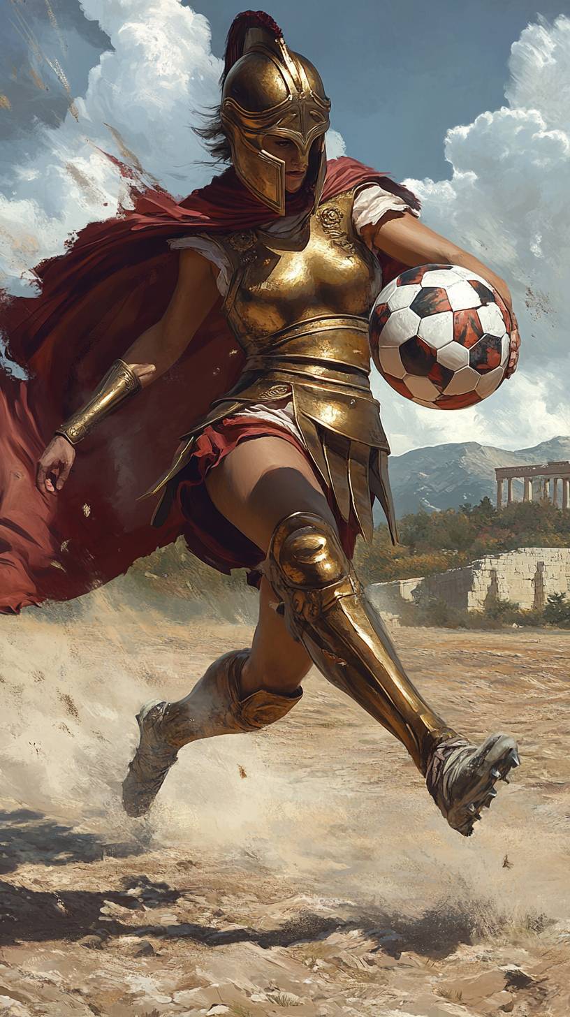 A female Spartan warrior, clad in bronze armor and a crimson cloak, is depicted mid-action as he delivers a fierce tackle during a soccer match on the dusty fields of ancient Sparta. The warrior’s footwear resembles traditional Greek krepis sandals, with leather straps and Spartan patterns, providing grip and stability. The soccer ball is a rudimentary leather sphere, decorated with patterns reminiscent of Spartan shields and battle insignia. The background features rugged landscapes and iconic Greek architecture, such as the Temple of Artemis, emphasizing the strength and discipline of the Spartan culture. The art style is classical, inspired by Greek pottery and sculpture, highlighting both the physical prowess of the warrior and the intensity of the sport --ar 9:16 --v 6.1