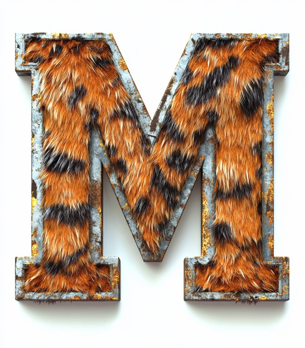 Letter "M" designed with tiger fur texture, vibrant texture, Pixar style, 3D style, realistic style, glossy and shiny rendering, ultra detailed, --ar 7:8 --stylize 200 --v 6.1