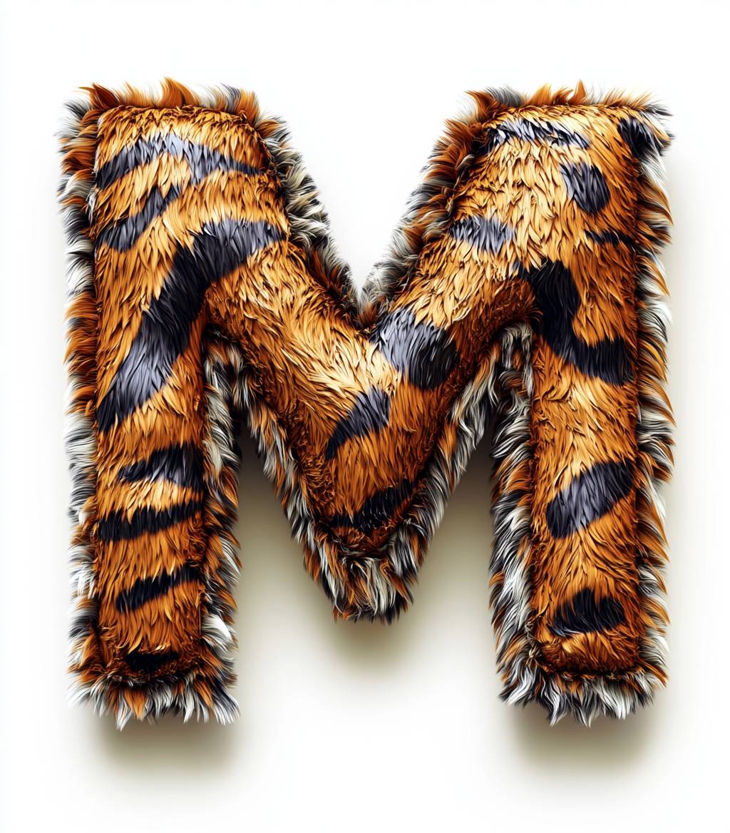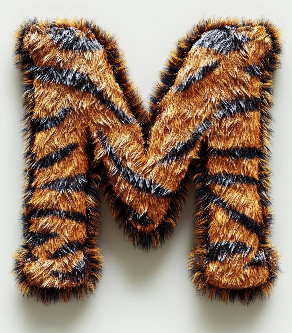 字母“M”以老虎毛皮紋理設計,生動的紋理,皮克斯風格,3D風格,寫實風格,光滑閃亮的渲染,超詳細。