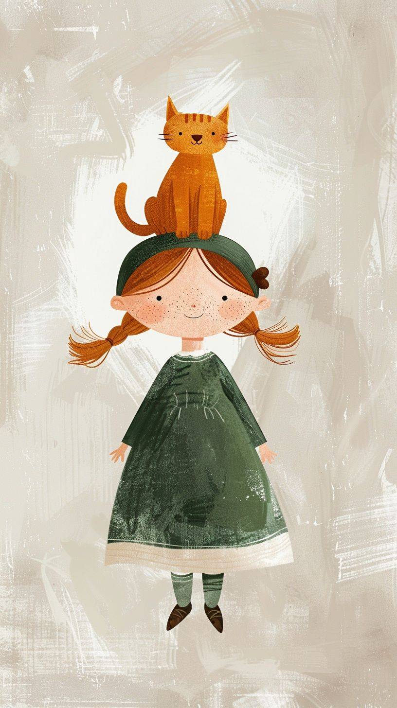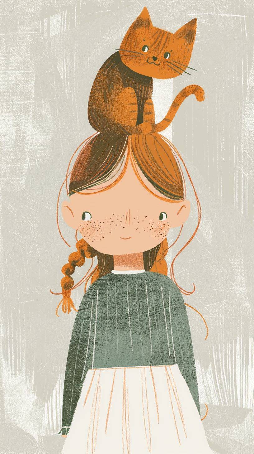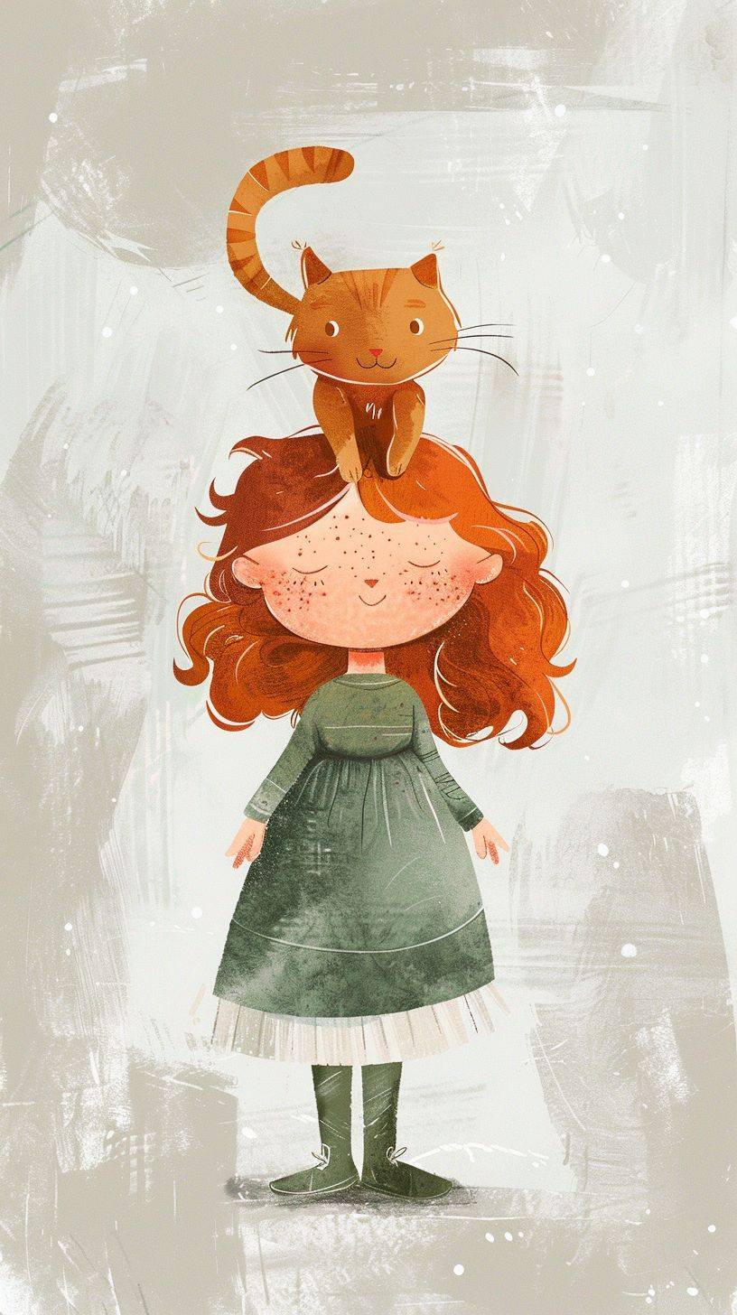 一幅平面數位插圖,描繪了一位可愛的小女孩,她有雀斑和一隻姜黃色的貓。她穿著一件綠色的長袖裙子,底部有白色的裙擺。背景色有微妙的淺灰色筆觸,營造出柔和的氛圍。她的表情洋溢著幸福,因為貓坐在她的頭上。