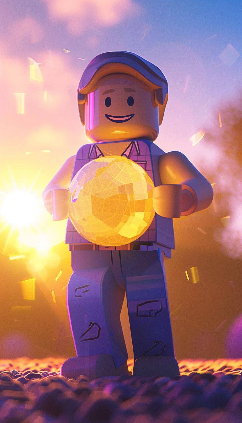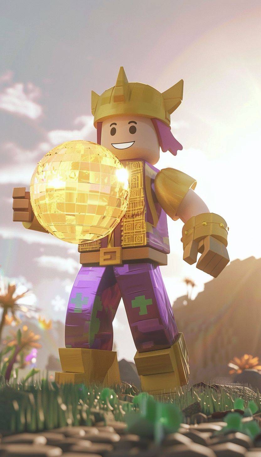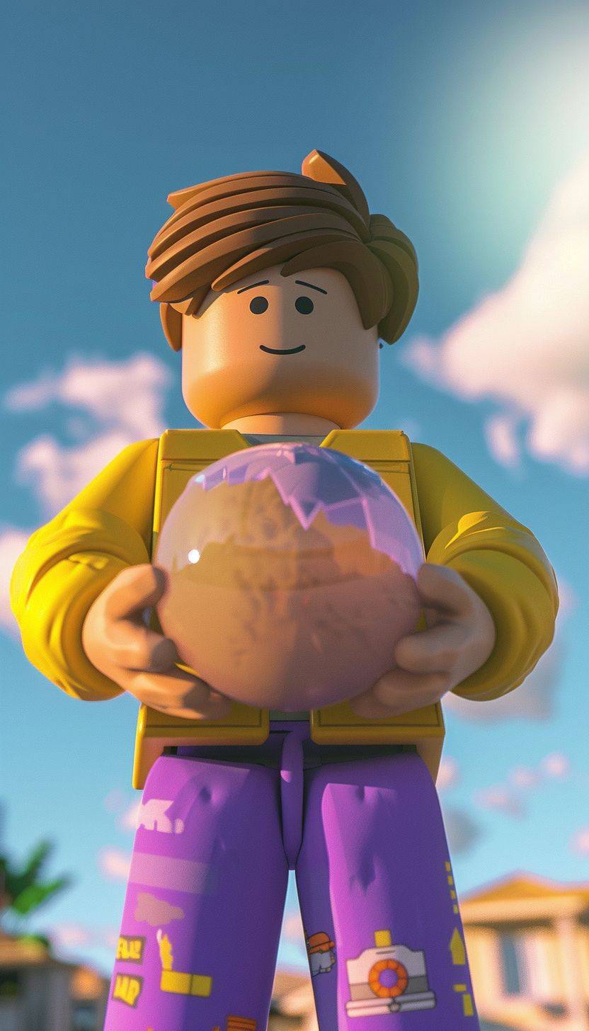 Roblox角色雙手抱著一個巨大的圓球,採用超現實動畫風格,淡黃色和紫色,讓它看起來友好而充滿玩樂氣息。