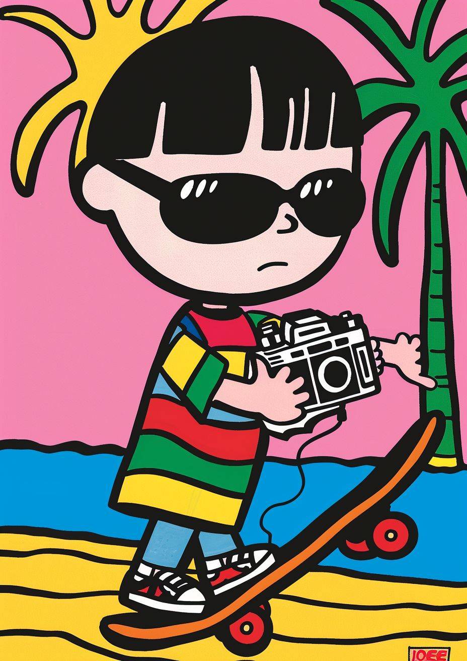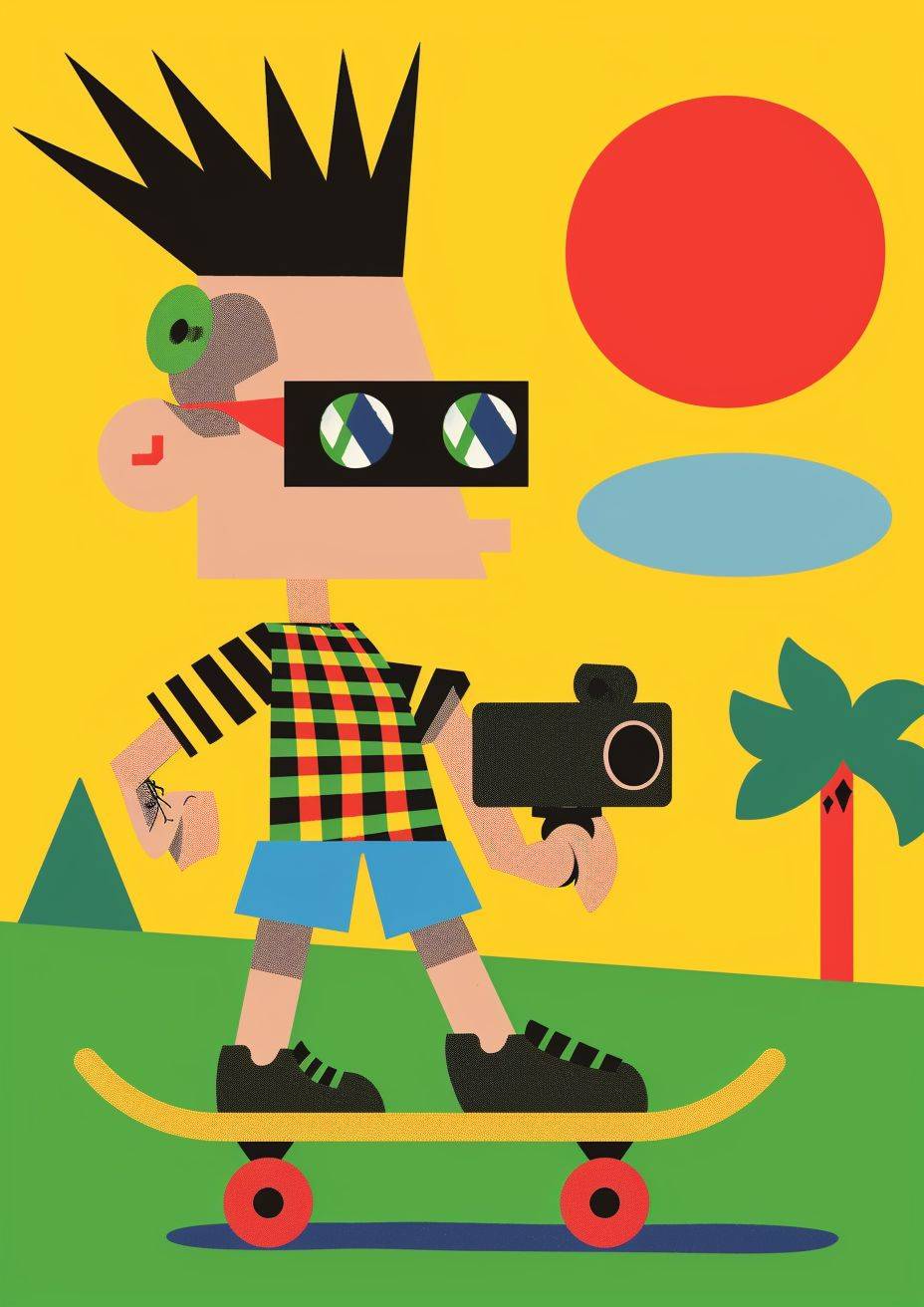 喬恩·科爾內利的藝術作品,以彼得·巴格風格描繪,頭髮扎成莫霍克的男孩正在滑板上玩,手持手持攝像機,戴著黑色藝術太陽鏡。