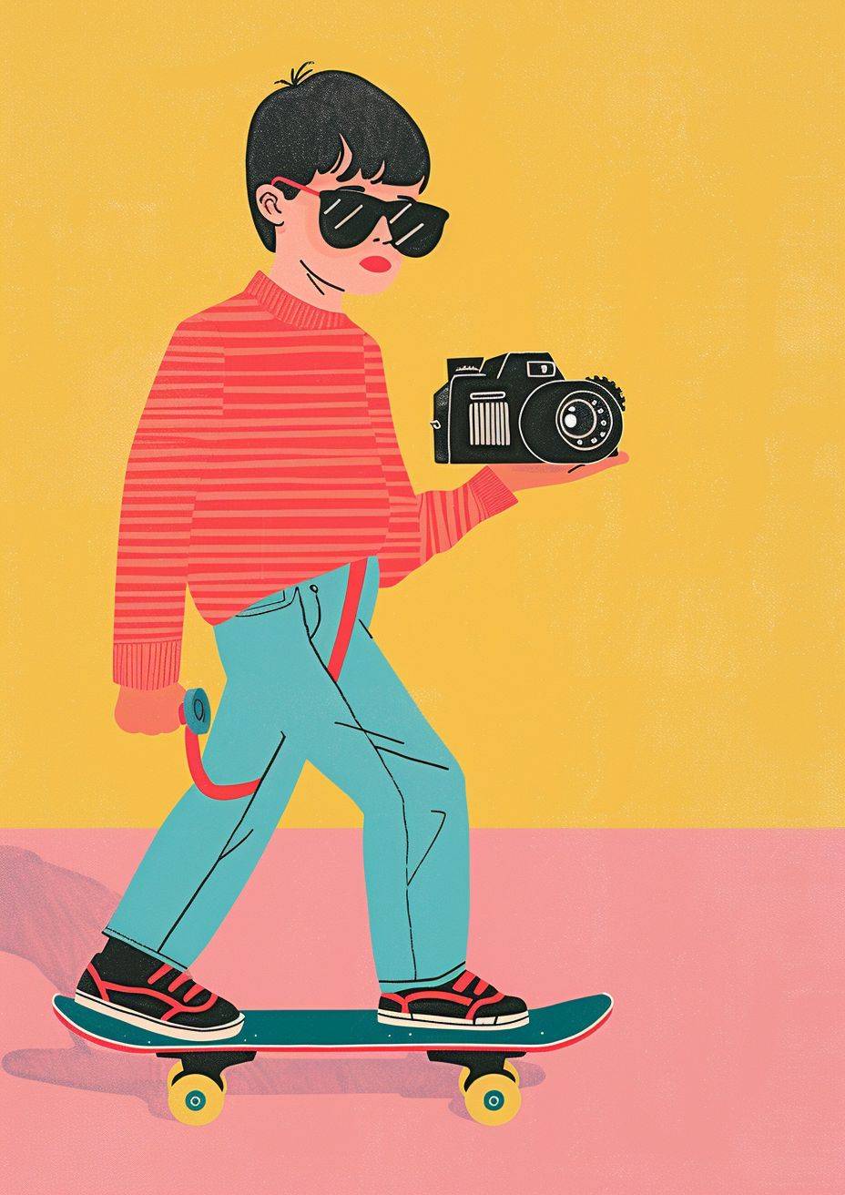 喬安·科爾內利亞風格的藝術,男孩留著流行的莫霍克髮型,玩滑板,手持手持攝影機,戴著黑色藝術太陽眼鏡。