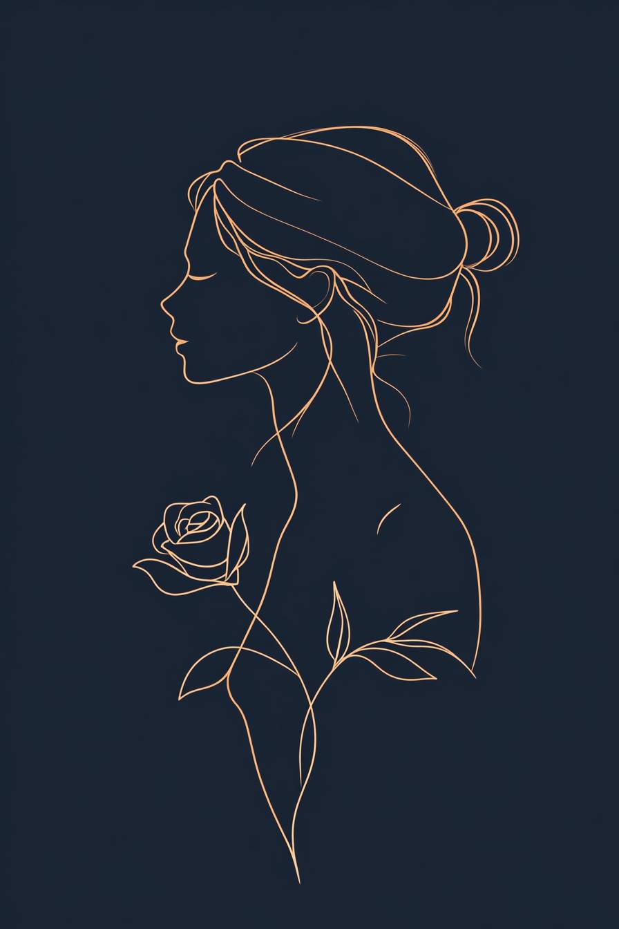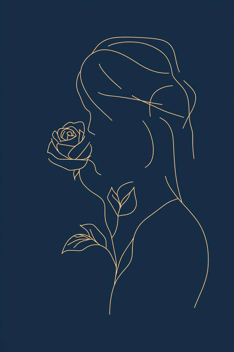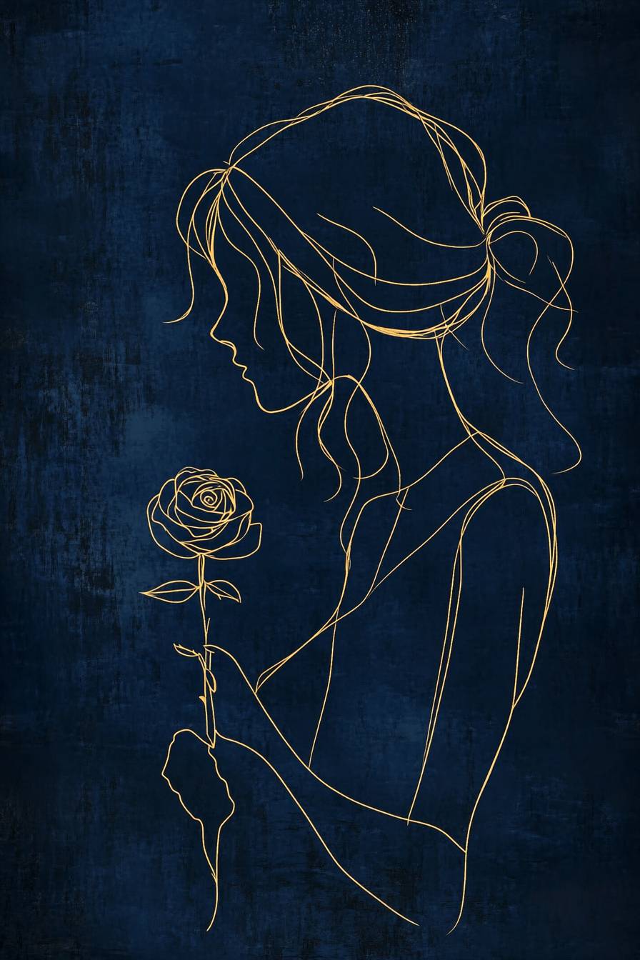 一幅簡單的線條畫,描繪了一位女性手持玫瑰。背景為深藍色,金色線條呈現,風格簡單,屬於現代藝術,使用簡單的形狀,女性身體輪廓的外形,極簡設計,簡單的木刻,單色,只使用黑白兩種顏色。
