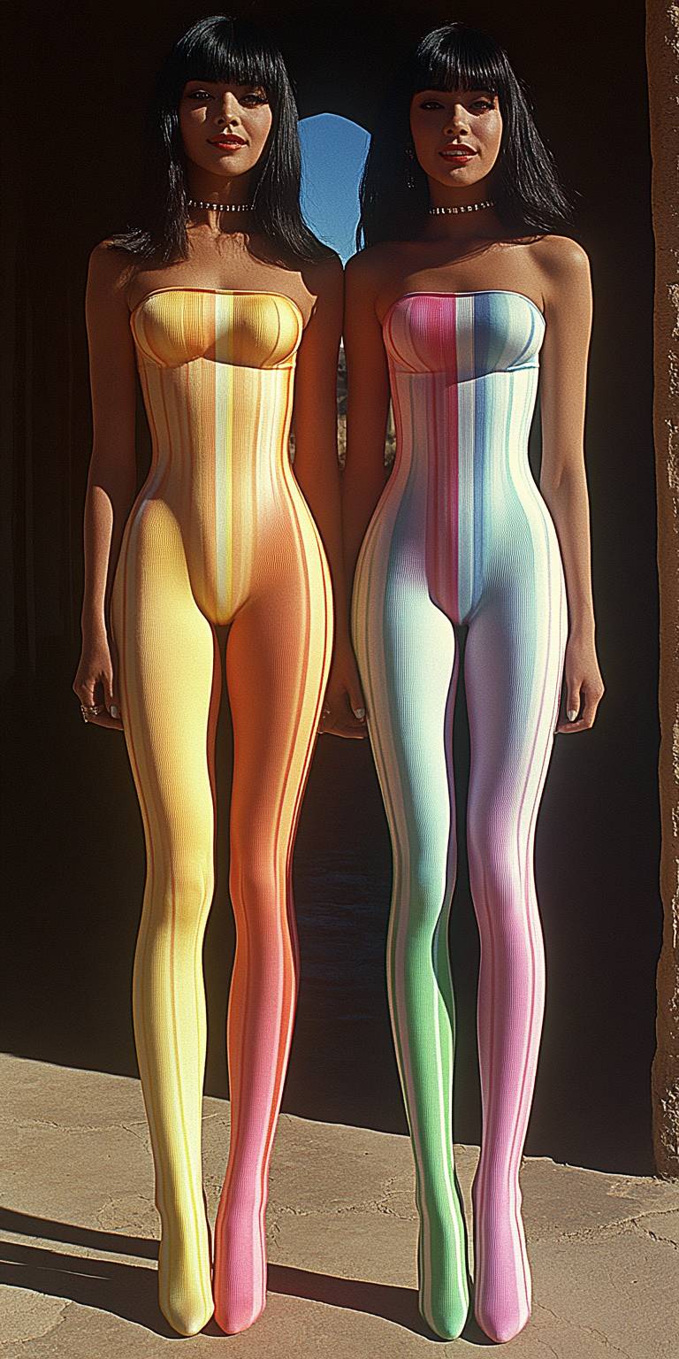 Two black-haired Chinese women, in multi-coloured stockings, full-length frontal shot, multi-layered composition, modern urban setting, sense of style, smiling expression, in focus, medium telephoto lens, natural light, vivid colours, vitality, friendly atmosphere.,,in clothes --chaos 100 --ar 1:2 --stylize 1000 --v 6.1