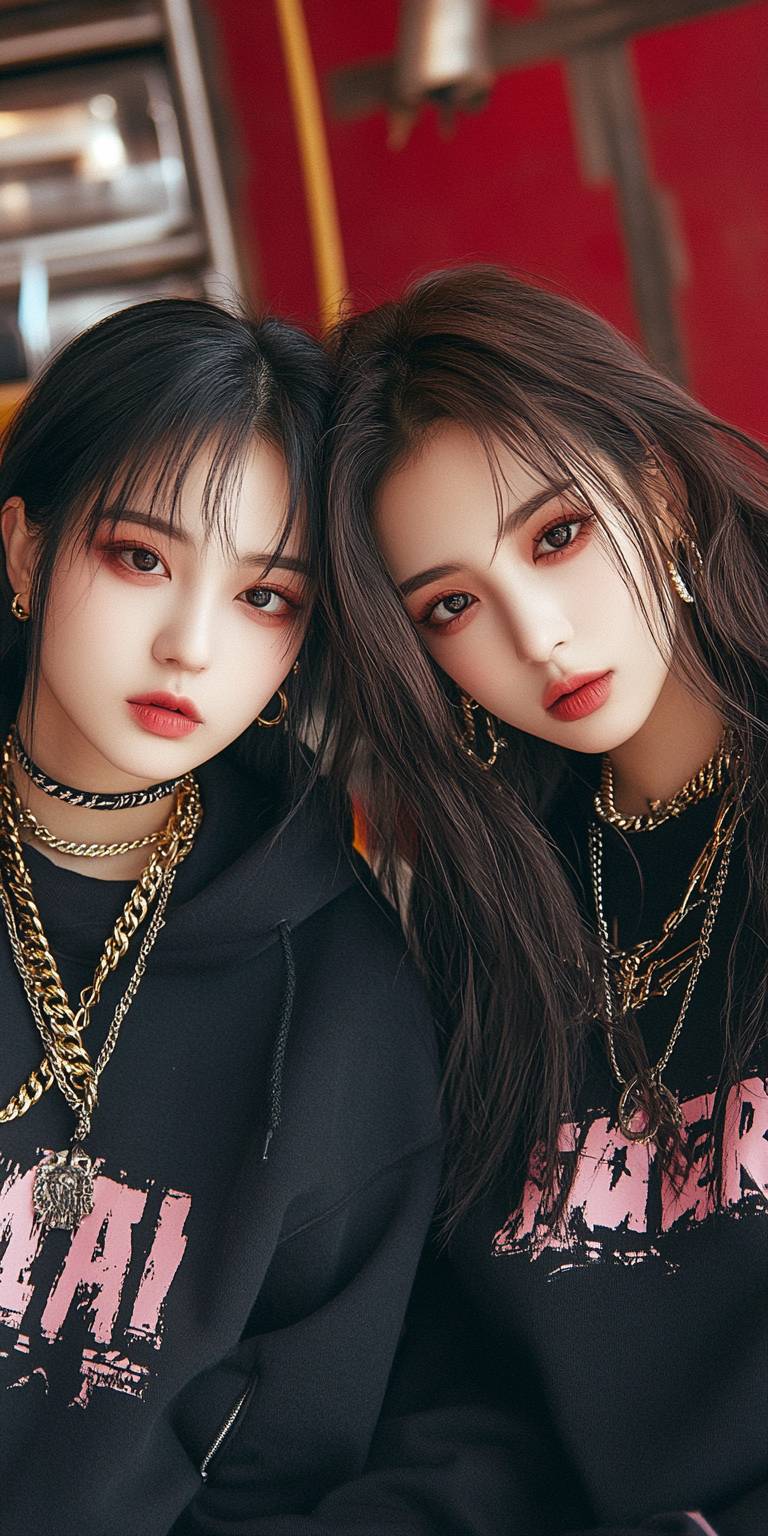 兩位黑髮中國女性,穿著五彩斑斕的長襪,現代都市背景下展現活力與友好氣氛。