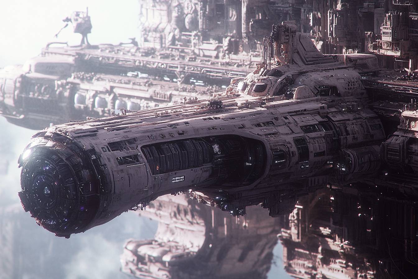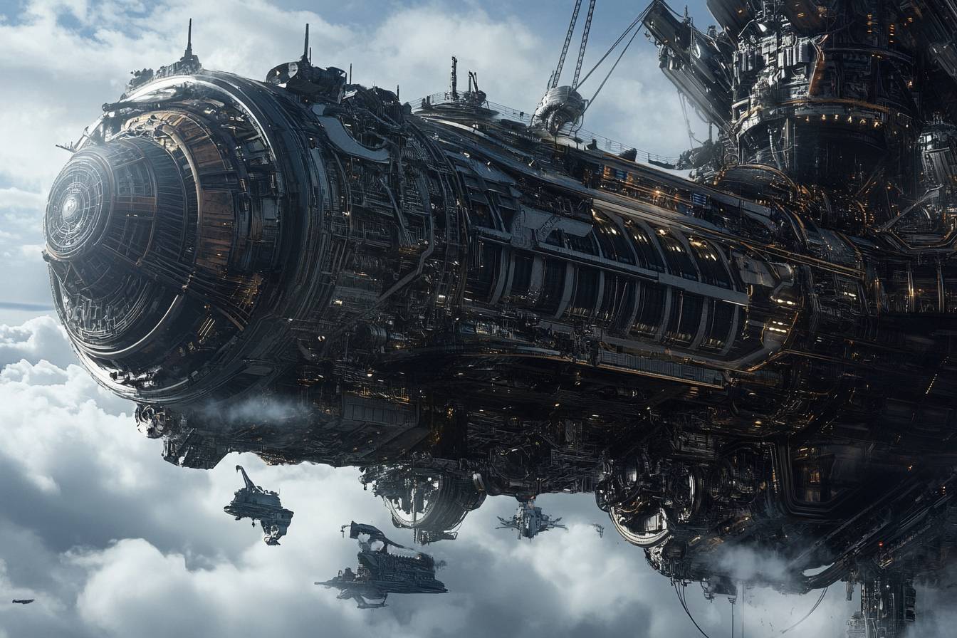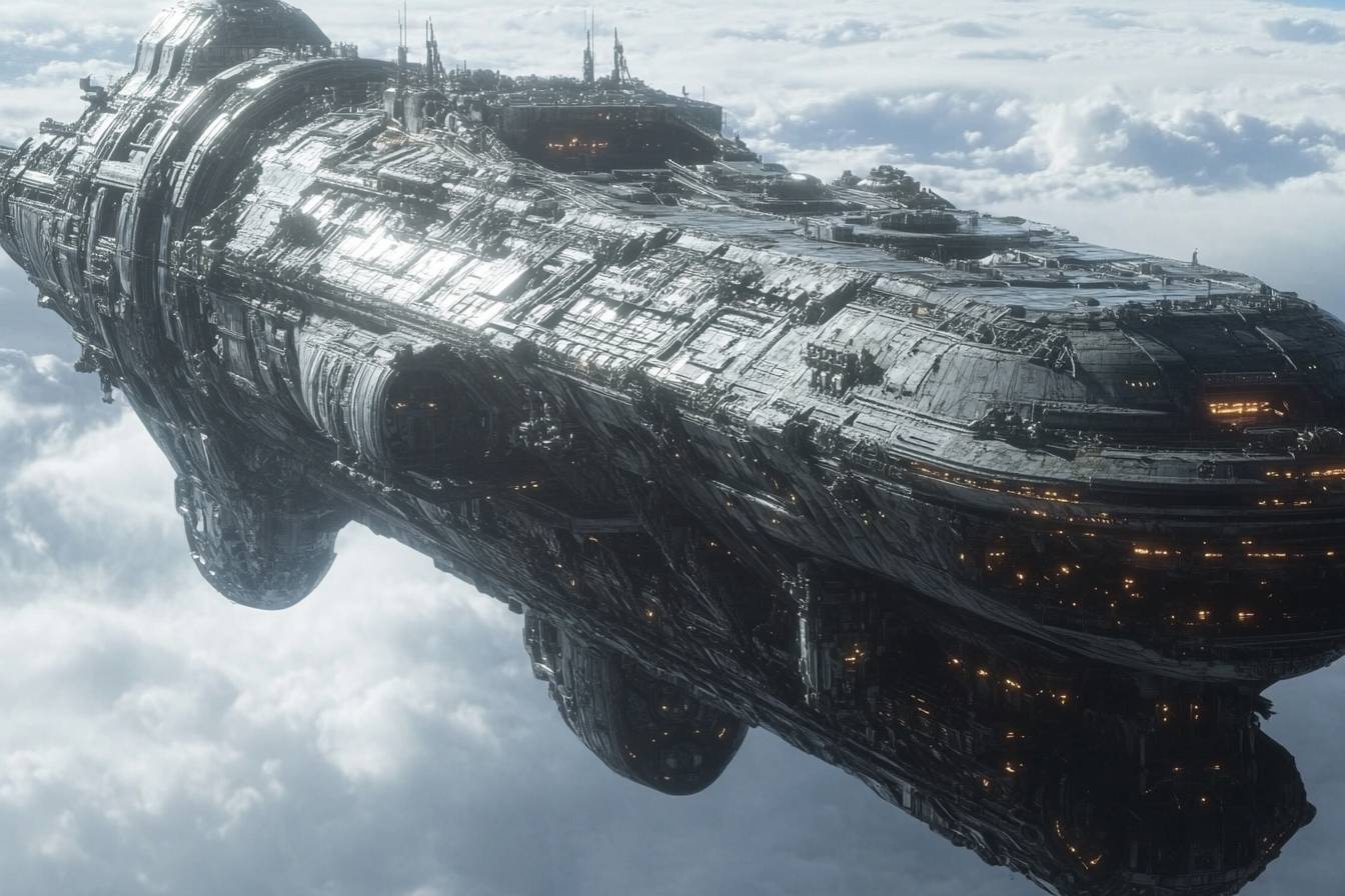 一艘巨大的[主題]。船體上布滿了複雜的細節,賦予其史詩般的科幻感。風格具有電影感。