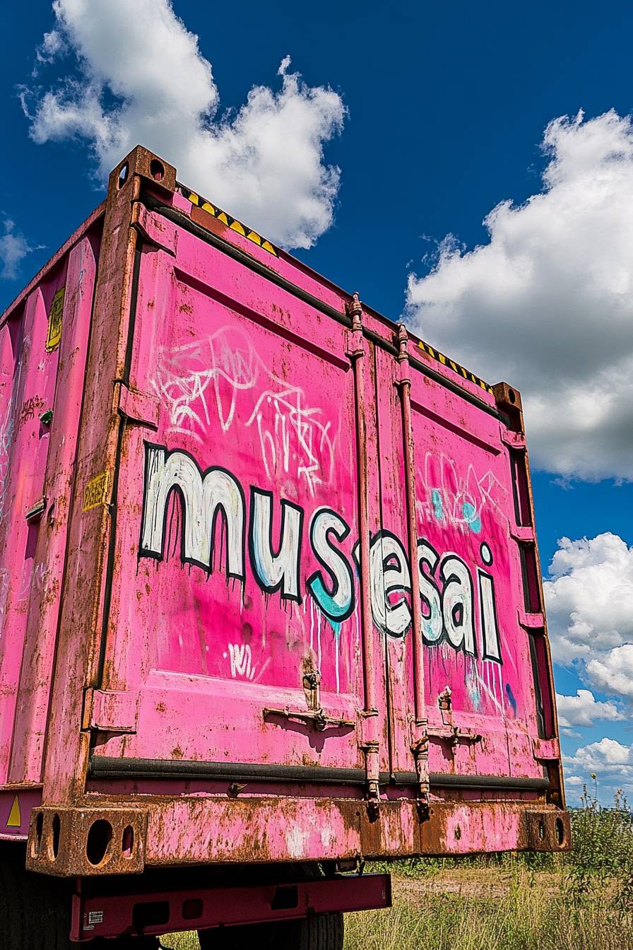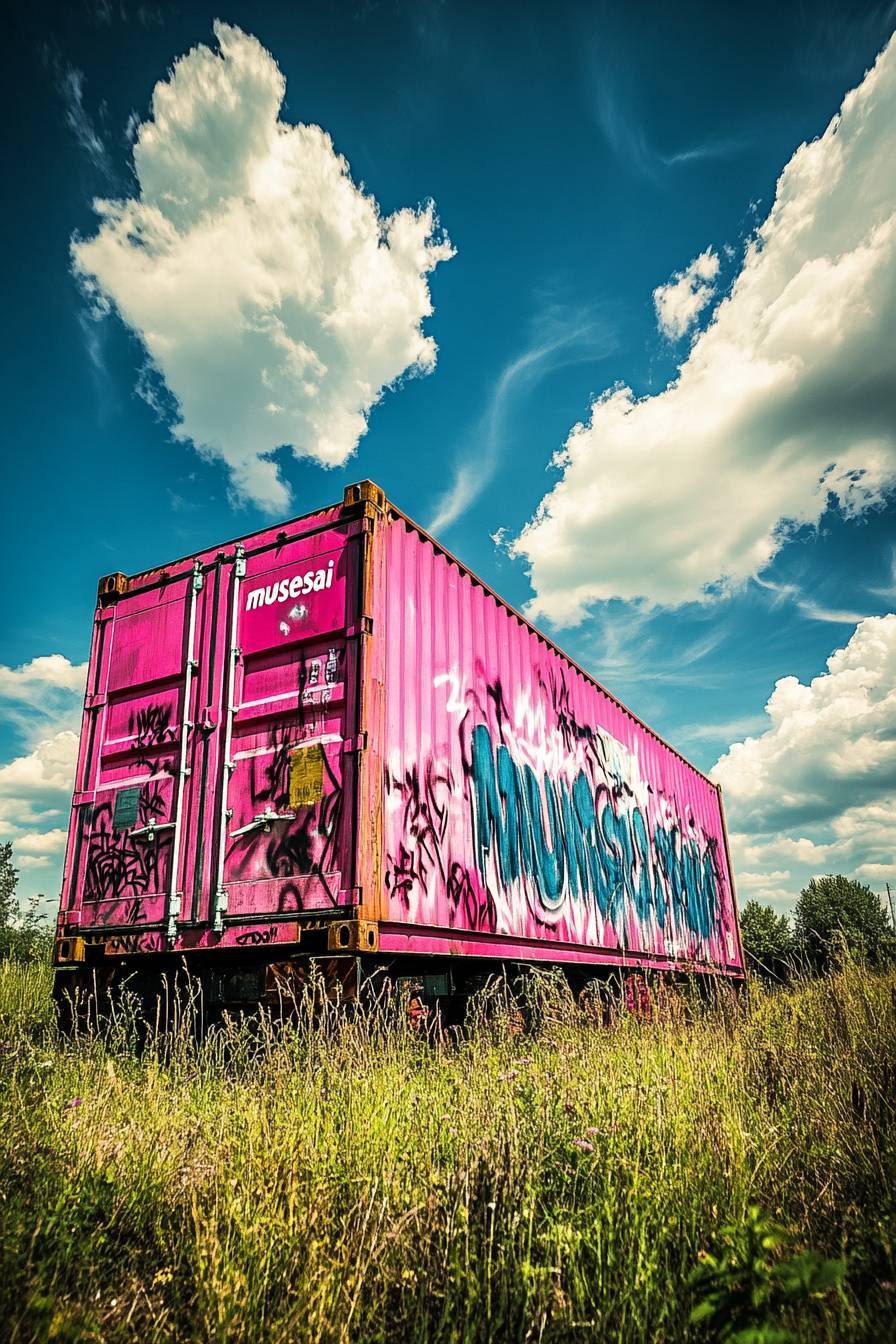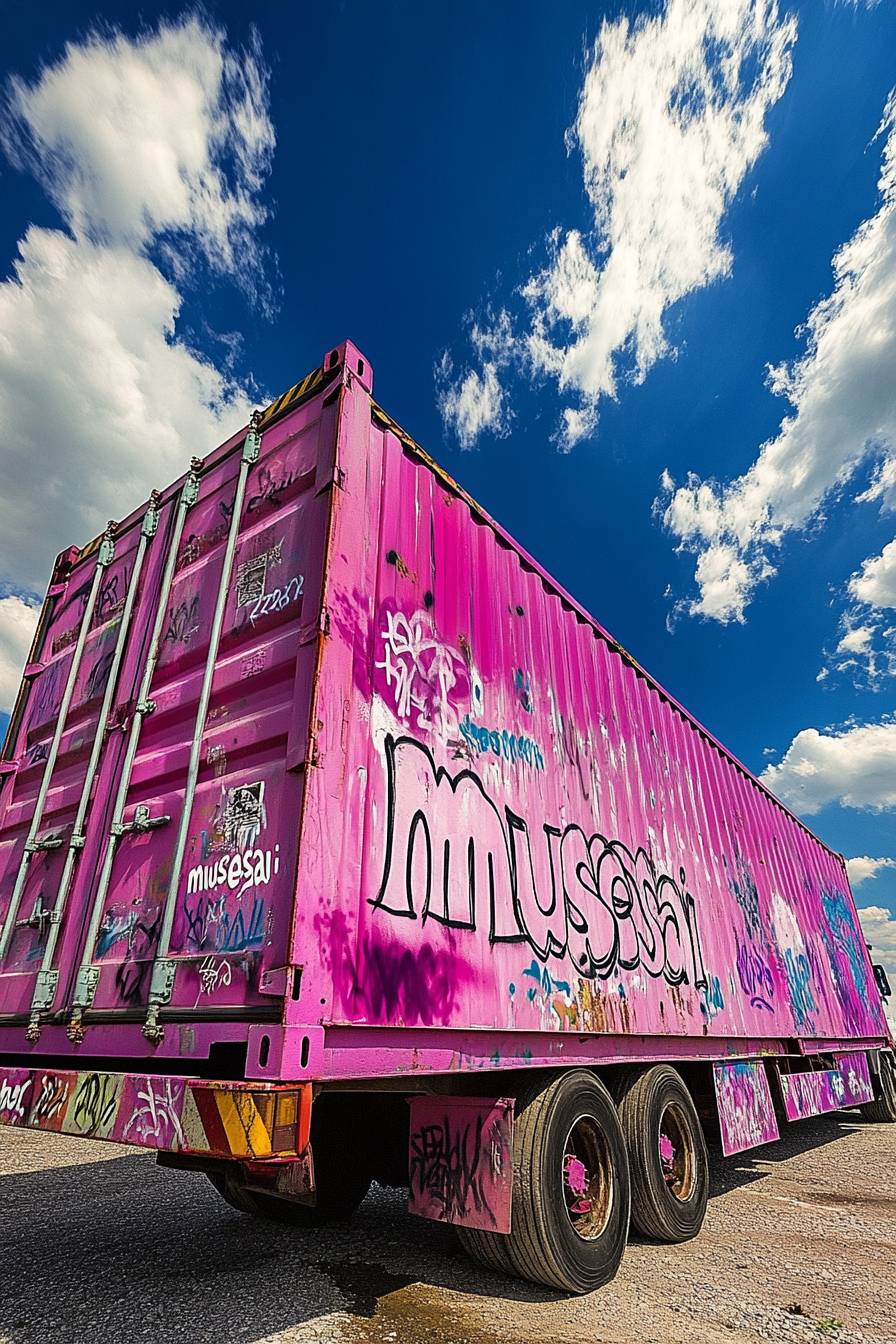pink Container truck graffiti "musesai", Blue sky and white clouds,HD 4K, Realistic photography, --ar 2:3 --v 6.1