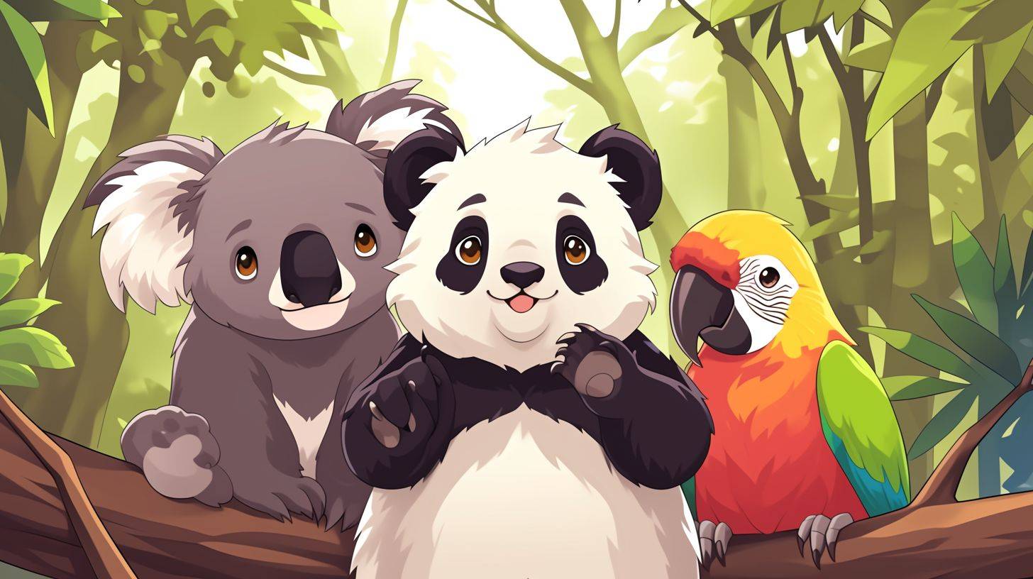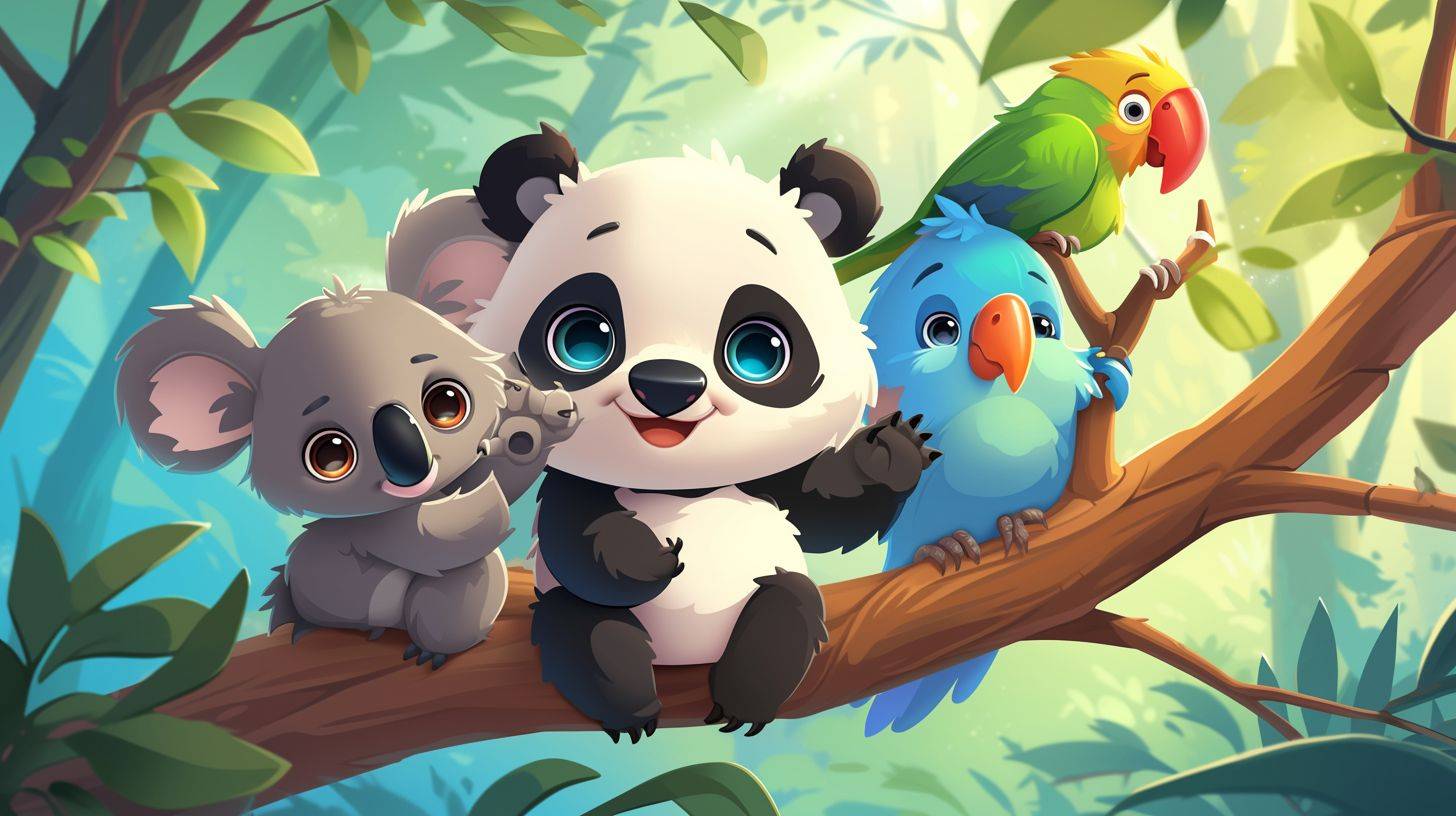 一群可愛的動物,包括熊貓、考拉和鸚鵡,站在森林裡,圖畫風格為兒童卡通,背景簡單,色彩明亮溫暖。