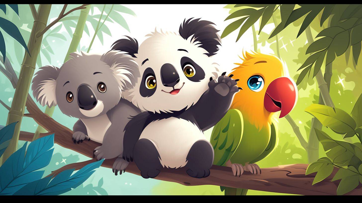 A group of cute animals [a panda bear, koala and parrot], stand together in the forest. The illustration is in the style of a children's style, cartoon style, with a full body portrait and closeup. It has a simple background with high-definition details and bright, warm colors. The eyes are friendly and the expressions are lively --ar 16:9 --niji 6 --style raw
