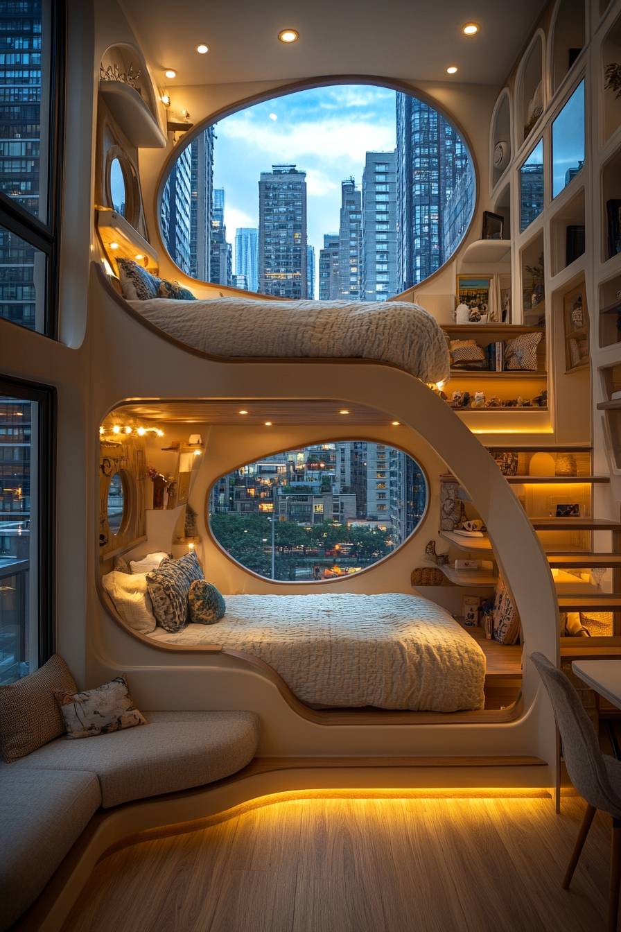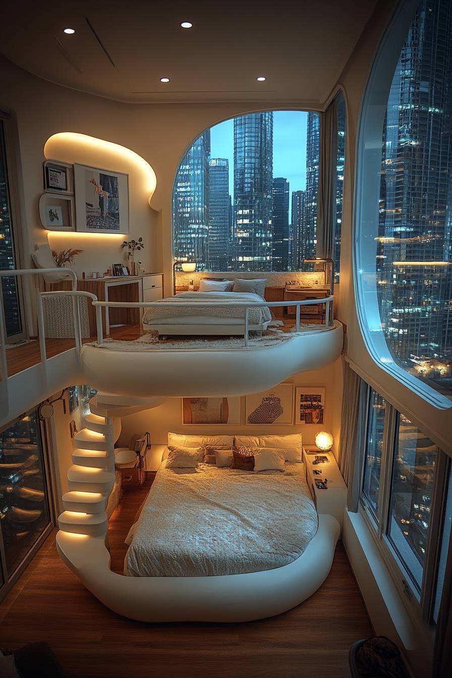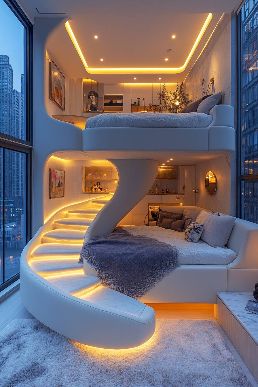 The double bed is in the shape of a spiral staircase. There is a sofa and a desk on the second floor. You can see the tall buildings from the window. The interior decoration is mainly light blue, creating a warm atmosphere. It adopts the realistic photography style of an unknown artist, floor-to-ceiling windows, and white lights. At night, the interior lights are bright. 4k ultra high definition --ar 85:128 --style raw --stylize 750 --v 6.1