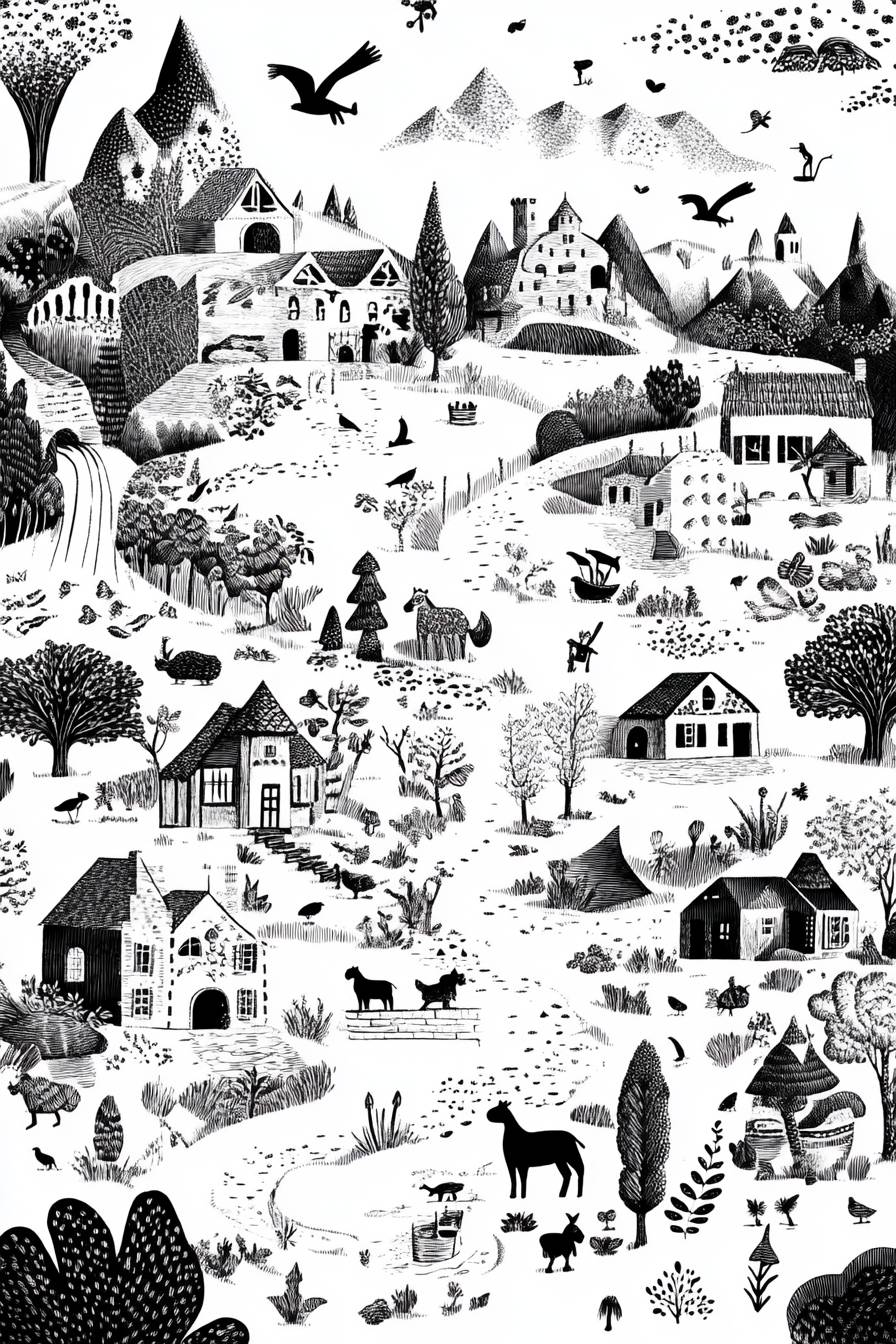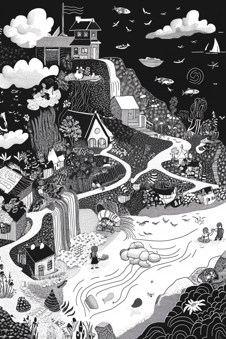 an illustration with the style of this image: [::1 ]--sw 800 The illustration in black and white and straight line shows many small elements that are components of the sao Miguel island (azores). Elements are : waterfall, lake, tropical trees, roads, geraniums, beach and mountain, animals like chickens cows dog cat,butterfly, boats, fish, little houses and a big wooden house on the top of the illustration, and a few people. Among the people, 3 persons should appear : a woman, a pregnant woman giving hand to his 2 years old boy. The illustration is unrealistic, isometric style::1 --ar 2:3 --v 6.1