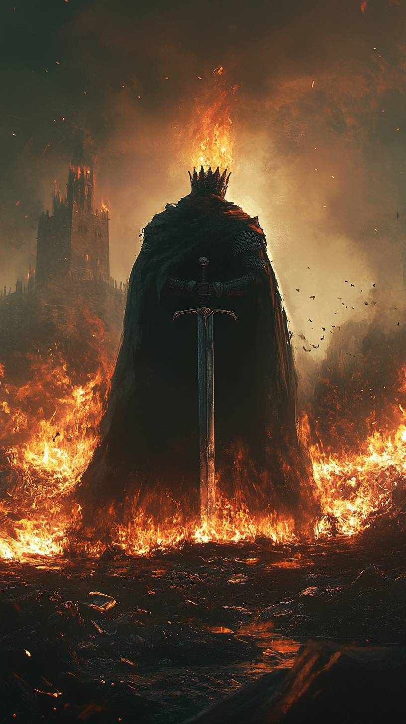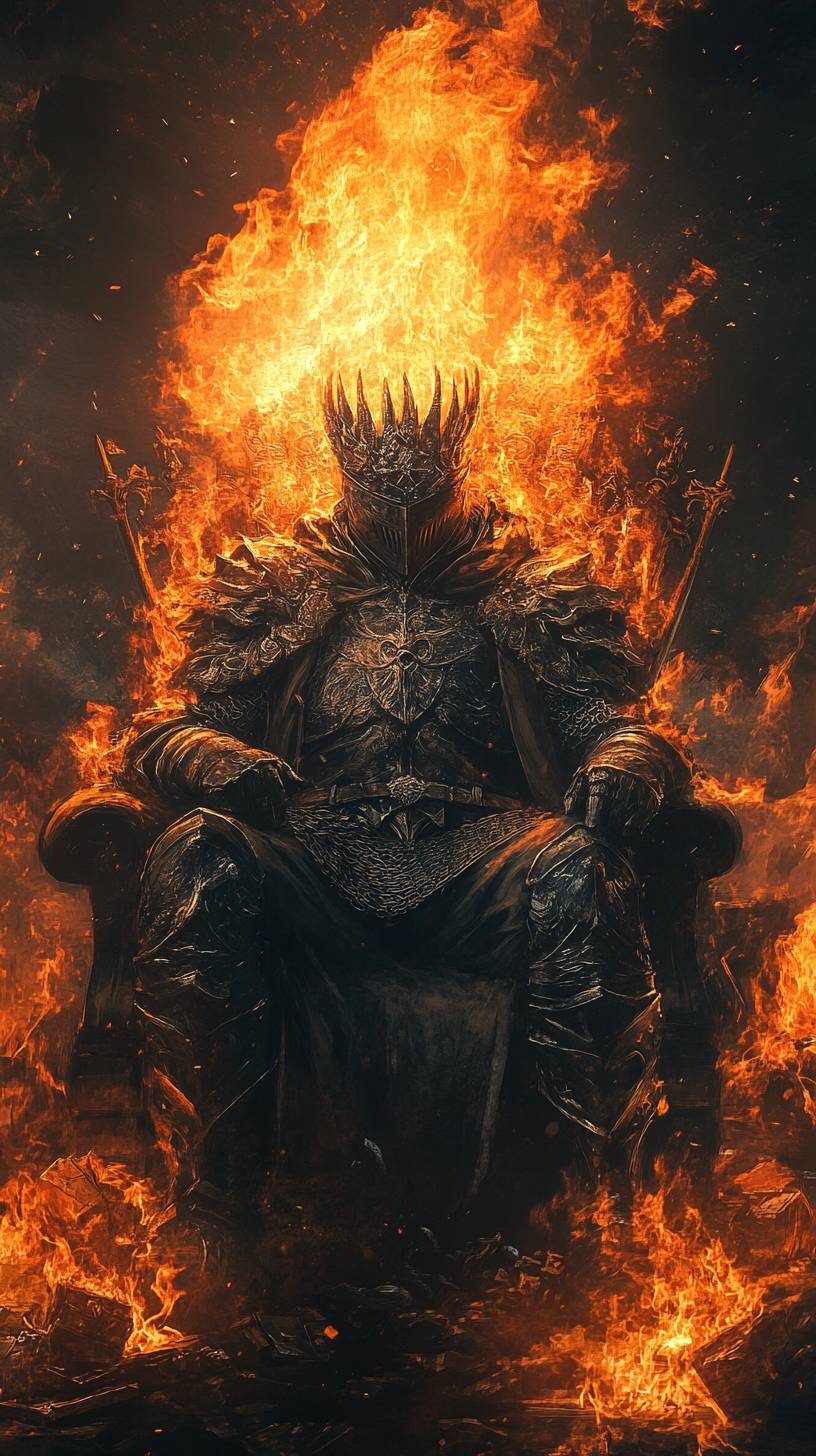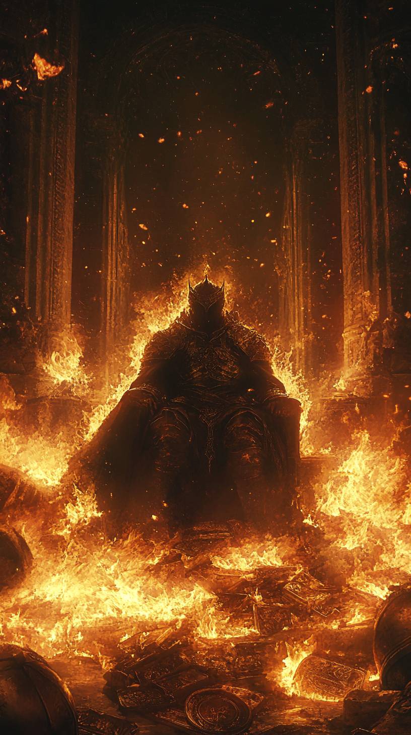 A king surrounded by burning riches, in a dark souls dark fantasy style, high resolution, highly detailed --ar 9:16 --v 6.1