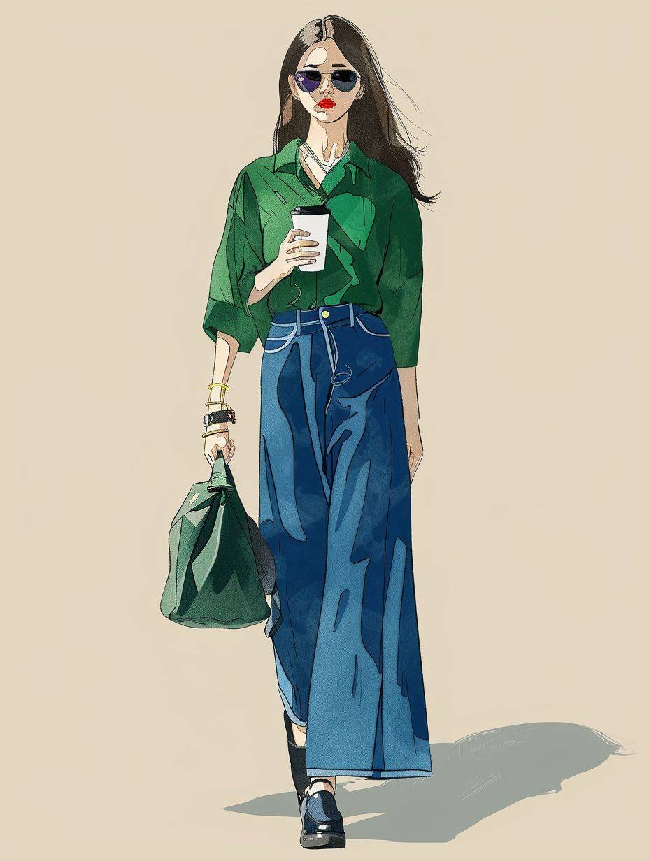 一位韓國模特穿著翡翠綠的襯衫、藍色長款鉛筆牛仔裙和黑色鞋子。她面戴太陽鏡,一隻手拿著咖啡,雙手提著包。簡單的背景,時尚插畫風格,全身照片,正面視角,簡單的細節,簡單的著色,平面插圖,平面繪畫,2D。