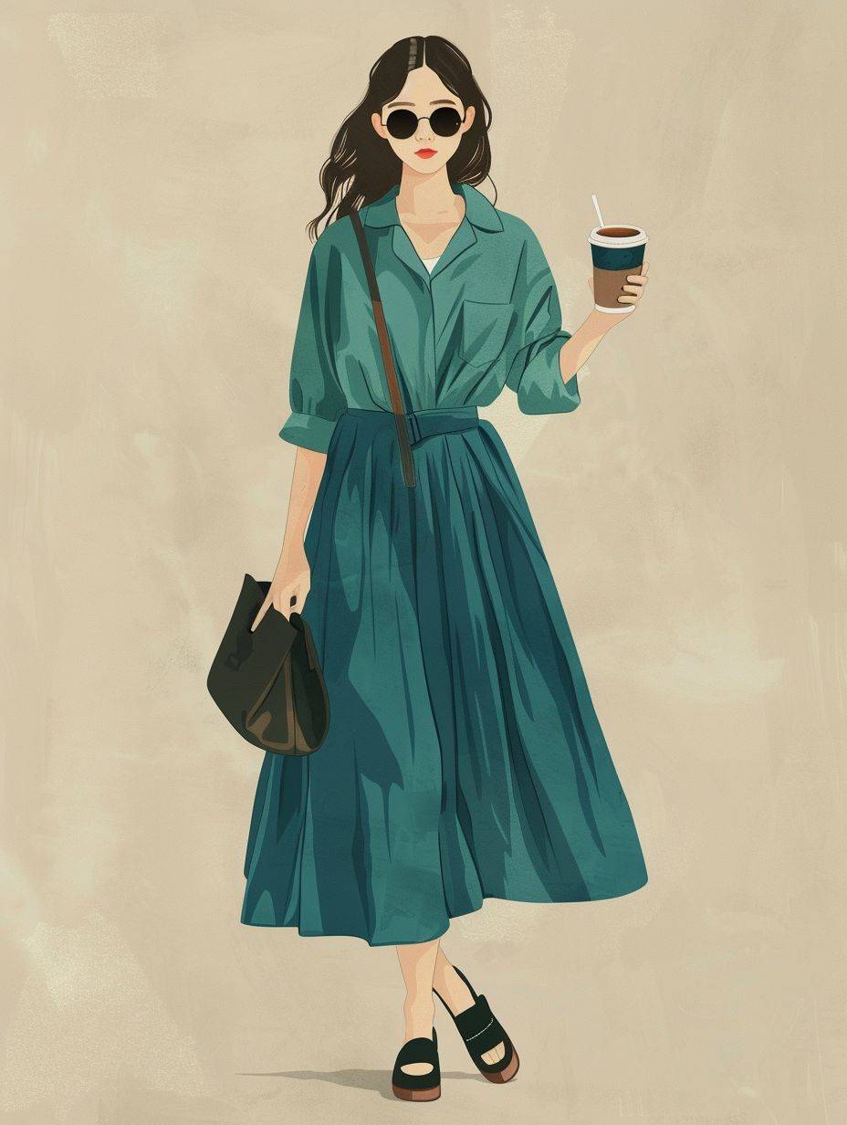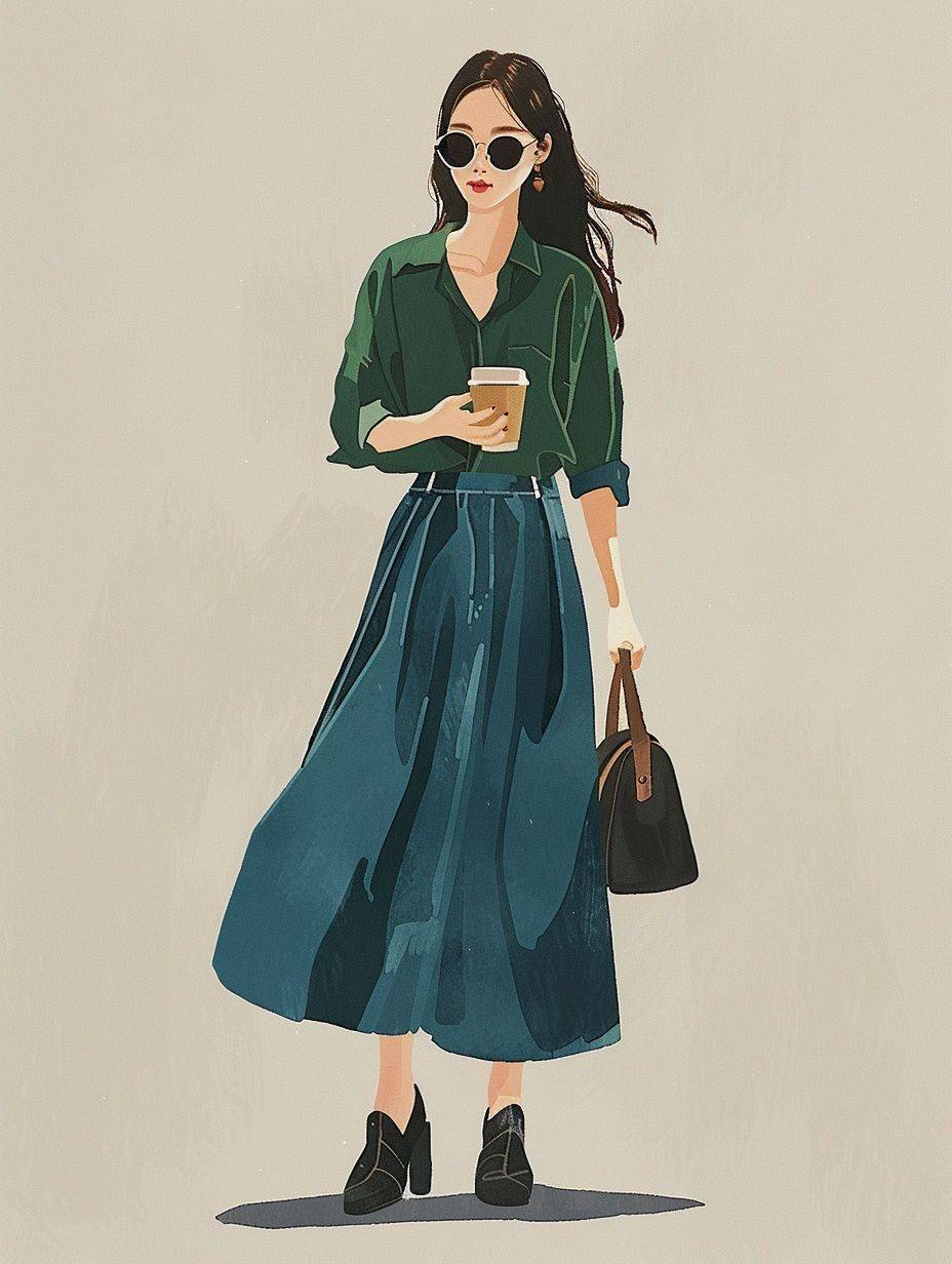 一位韓國模特身穿翡翠綠衫、藍色鉛筆長裙和黑色鞋子,手持咖啡,雙手提著包,背景簡單,呈現時尚插畫風格。