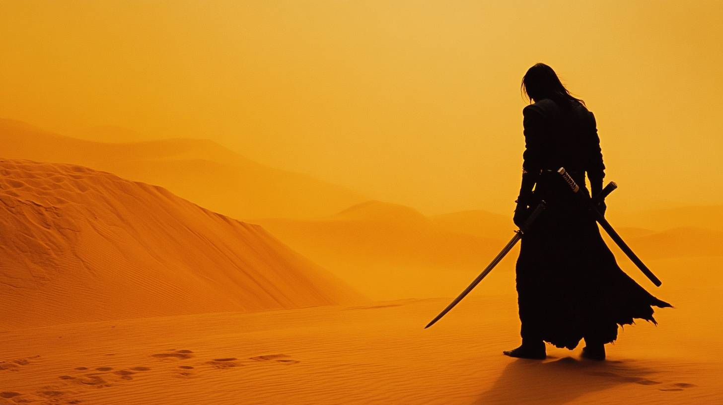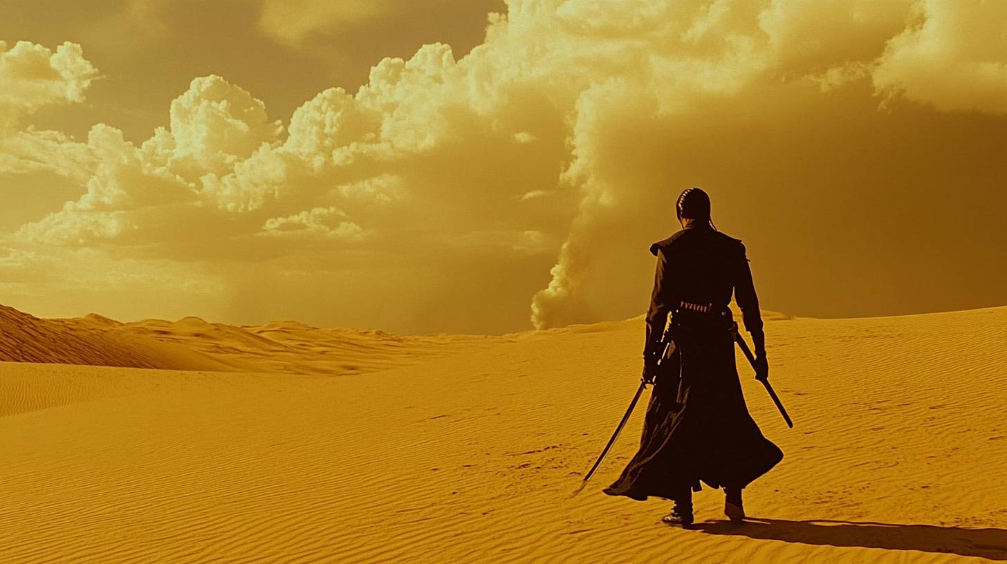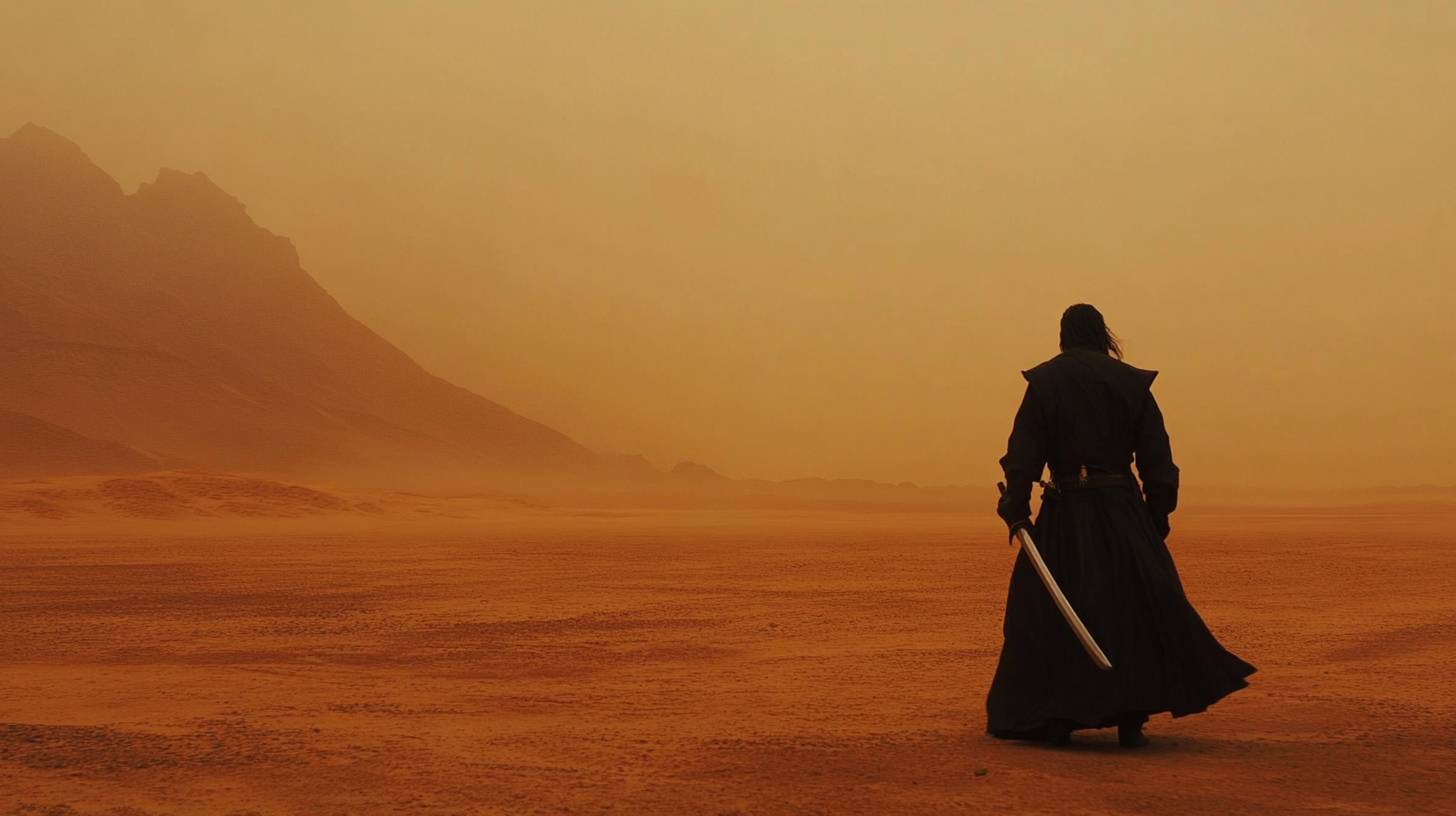 Wong Kar Wai style film , A swordsman in the desert, alone. --ar 16:9 --v 6.1