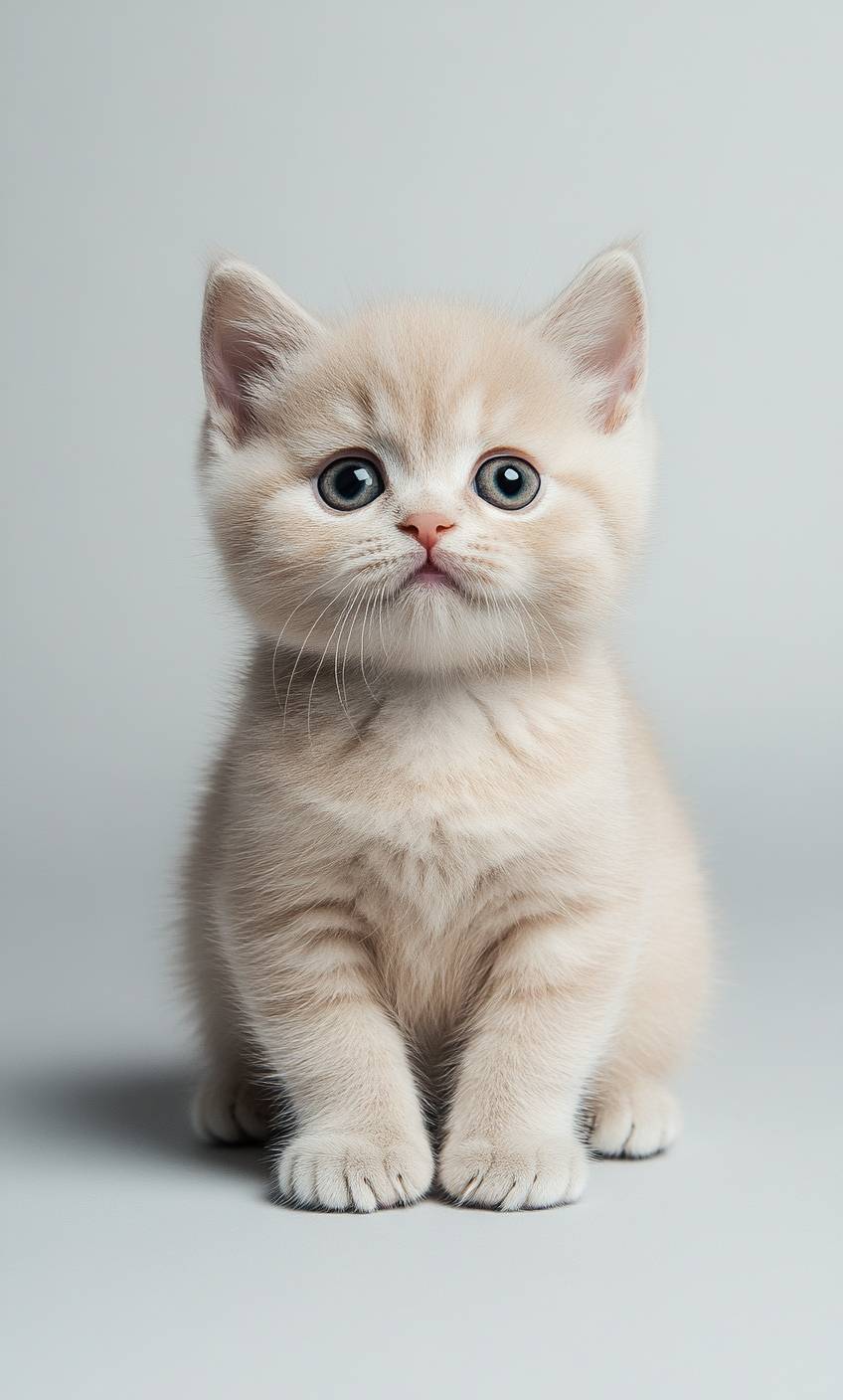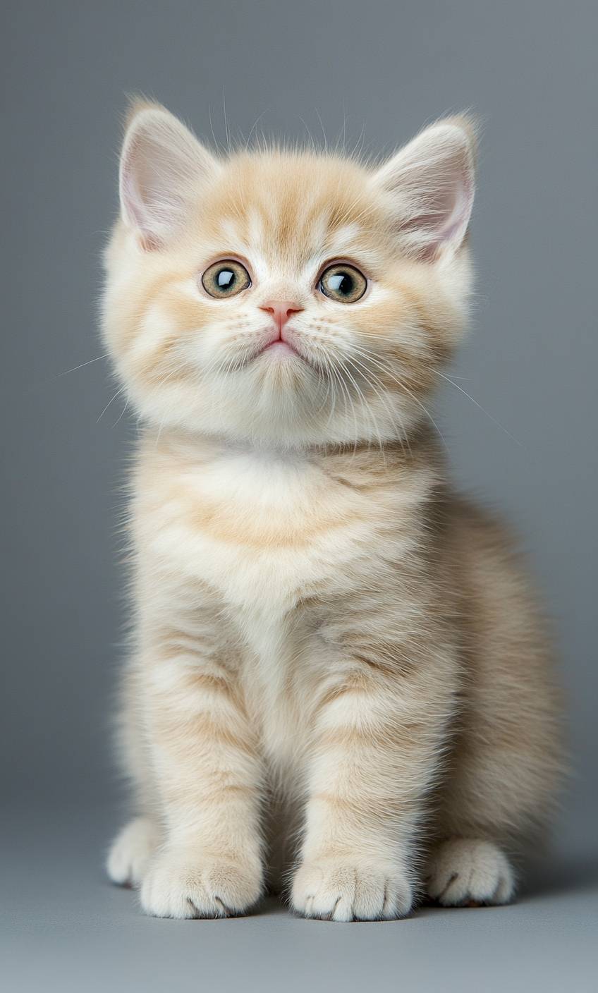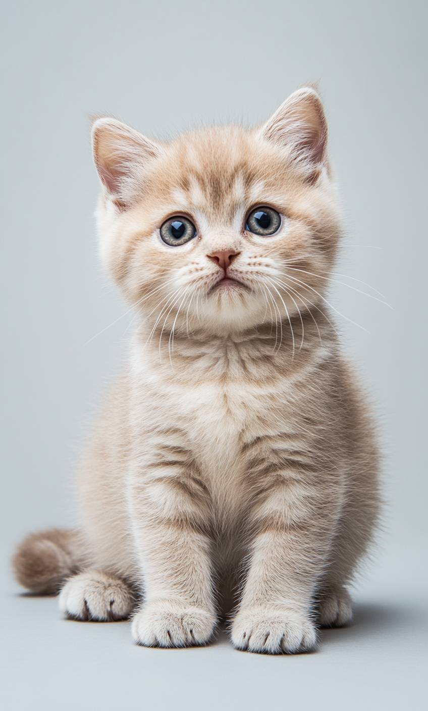 用一隻可愛的香檳金色英短小貓取代狗,坐著並面向前方,表情好奇。工作室燈光,高解析度,惹人喜愛。