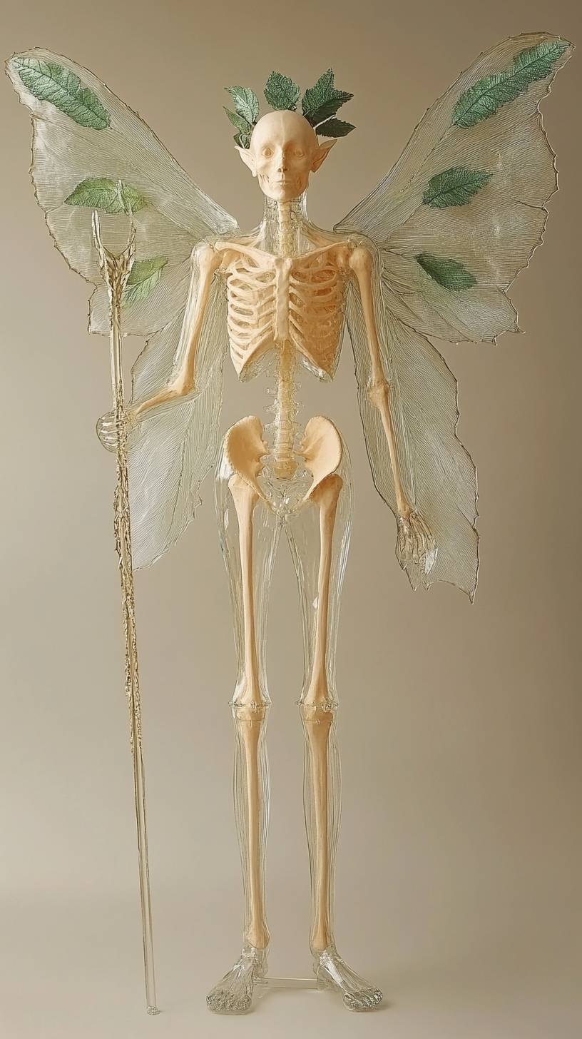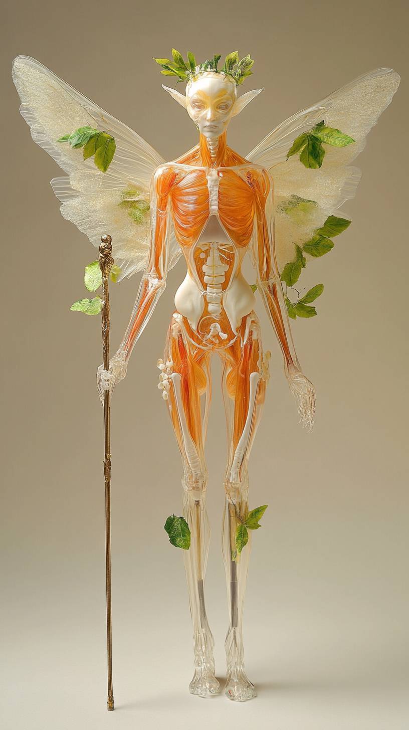 一個全身的解剖模型視圖,帶有翅膀,手持一根權杖,由透明材料製成,皮膚呈淡橙色,翅膀形狀像仙女的翅膀,背景為米色。這個模型身穿白色衣服,頭部和手臂上裝飾著綠色的葉子,腿部很長,看起來像是由透明玻璃或塑料雕刻而成。它沒有面部特徵,而是戴著一頂皇冠。這個姿勢暗示它可能是作為科學設備的一部分而被設計用於展示。