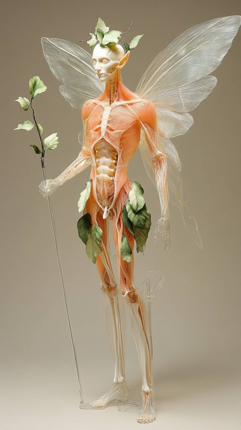 A full-body view of an anatomical model with wings and holding a staff, made from translucent materials, with pale orange skin, in the shape of fairy wings, against a beige background. The figure is wearing white adorned with green leaves on its head and arms, with long legs that appear to be sculpted out of clear glass or plastic. It has no facial features but instead wears a crown. This pose suggests it may have been designed for display as part of scientific equipment. --v 6.1 --ar 9:16