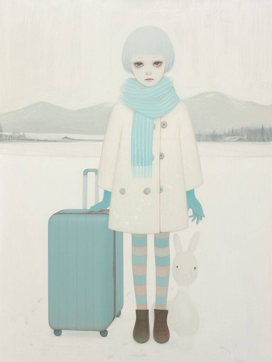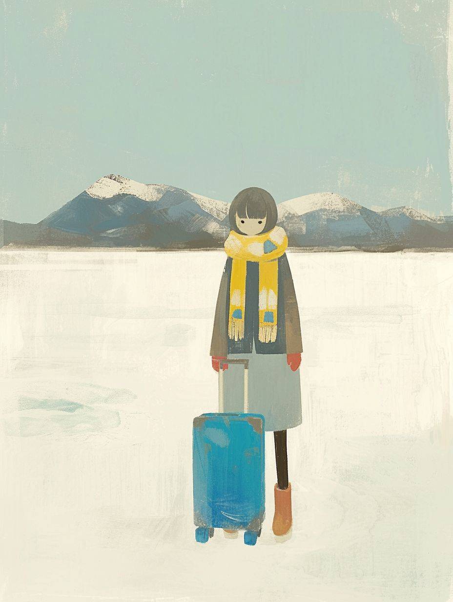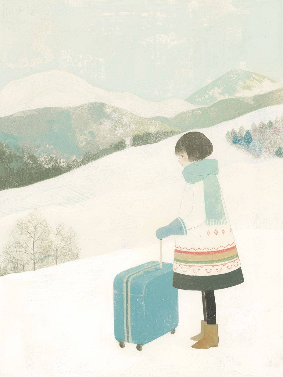 一位留著短髮的女孩,手提藍色行李箱,戴著手套和圍巾,背景是一幅冬季風景的簡單插畫風格。這是一幅彩色鉛筆畫,採用淺灰綠色調,並利用白色空間增強視覺效果,風格類似於蕭榮誠的作品。此藝術作品受到了兒童書籍插畫和豐富多彩的木刻版畫風格的影響,具有中國文化主題。