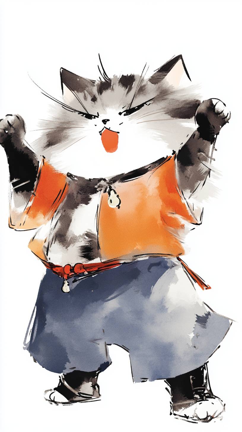 善良的貓皇,穿著秦皇衣服的可愛貓,正面視圖,左側視圖,擬人化的貓,自然光,黑色眼睛,純白背景,白色背景,流暢的線條,清晰的筆觸,書法與墨畫,鋼筆與水彩,中國風,馮子愷與傅抱石的藝術風格,大場景。漫畫,後現代藝術,甘德藝術,白色背景,完整的全身肖像。