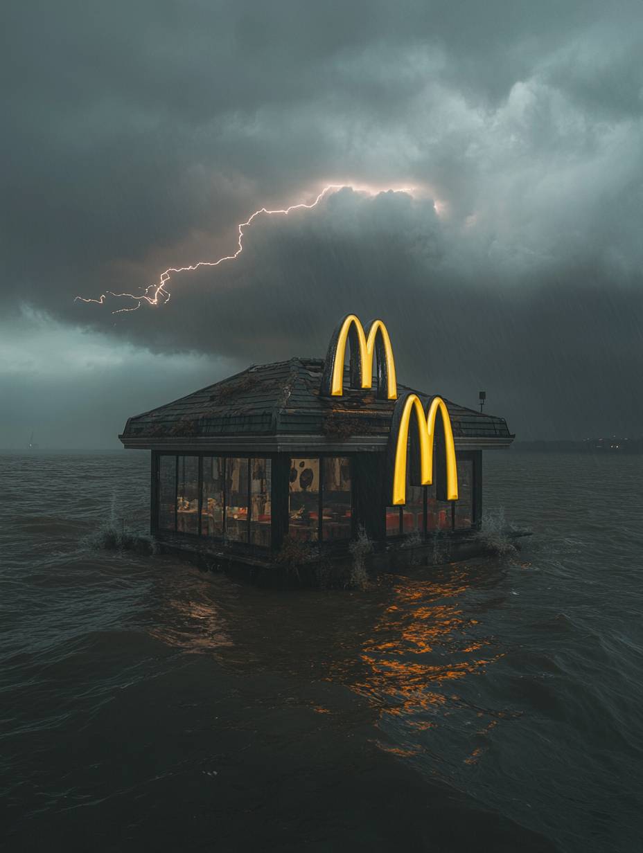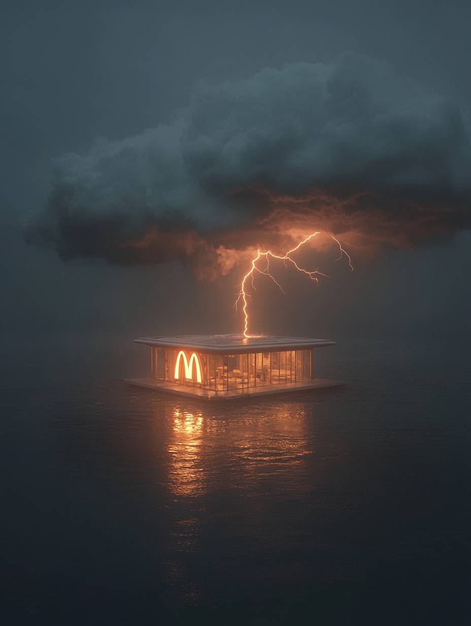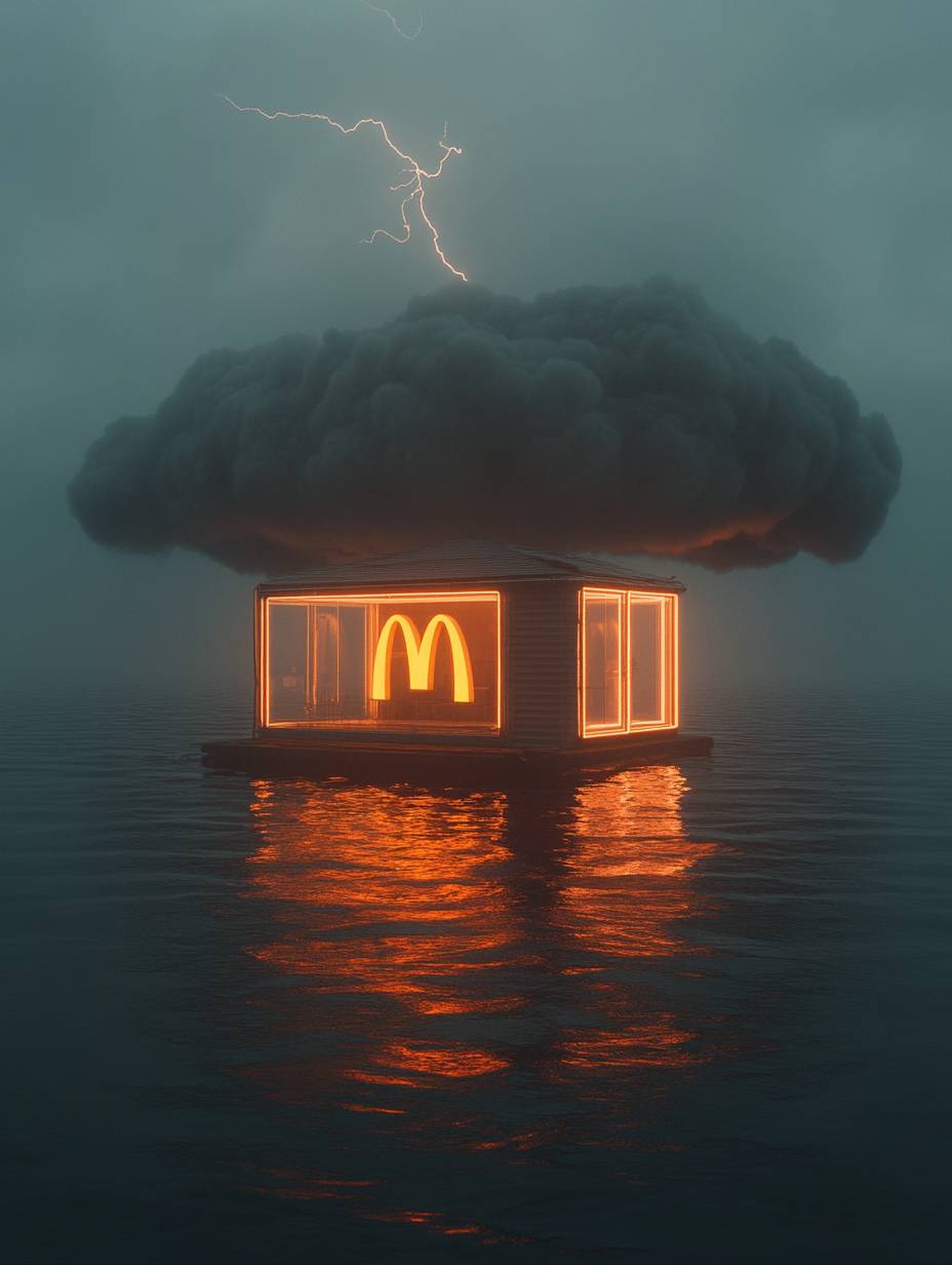 ultra minimal, lonely house with McDonald’s logo in the middle of a river, with a massive, dark storm cloud swirling above, a single lightning strike illuminating the scene, ambience --ar 3:4 --personalize 881rkib --stylize 1000 --v 6.1