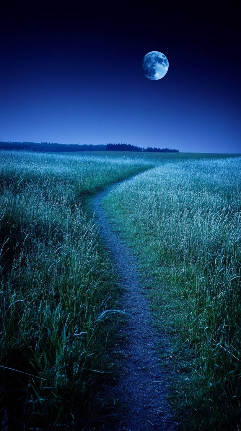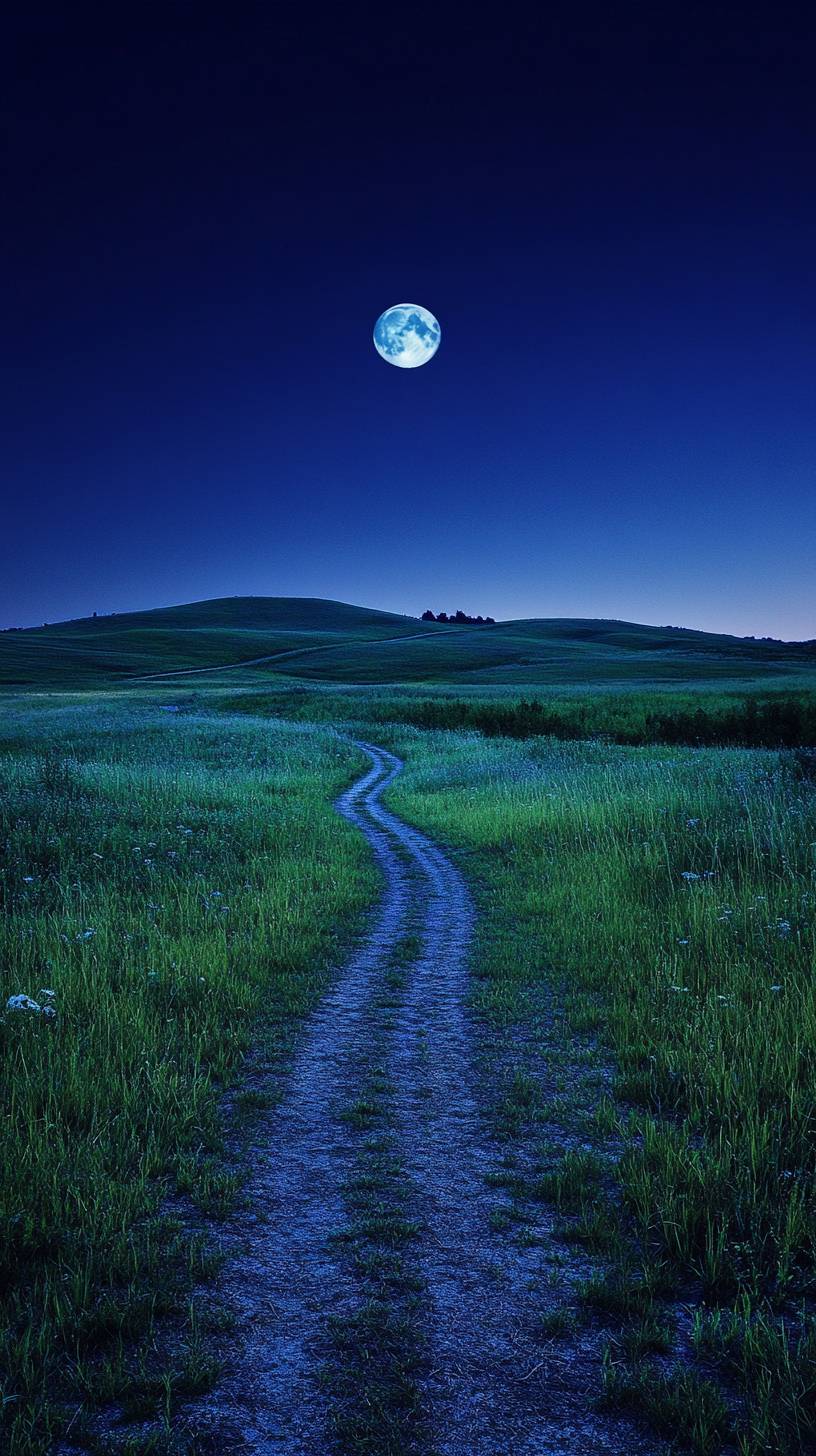 night, endless grassland, a path leading to the distance, there is a real photoing effect of the moon in the distant sky, ultra high definition, ultra wide angle --ar 9:16 --style raw --v 6.1