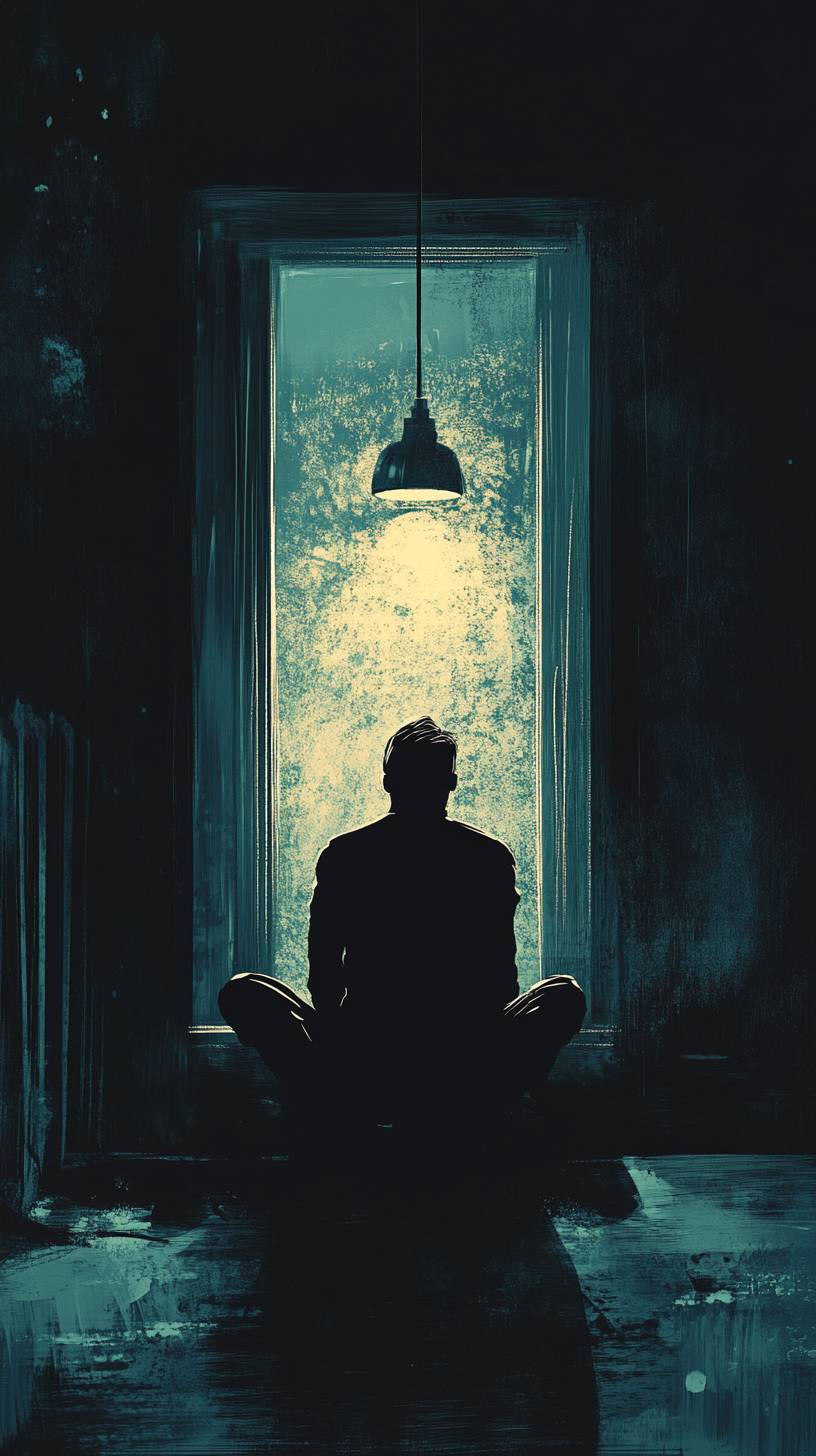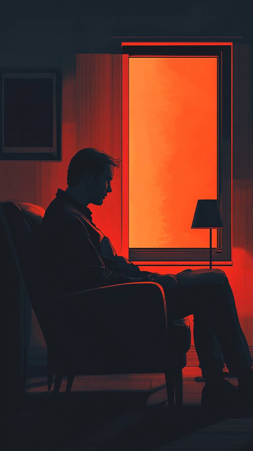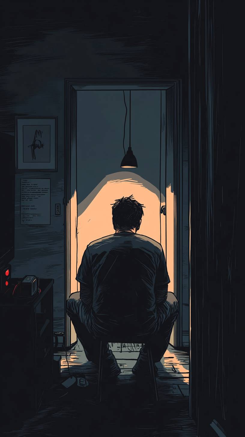 a man sitting alone in a dark room, sad, avoiding calls. in the style of Sam, a vintage-style poster featuring a simple line drawing. --ar 9:16 --stylize 250 --v 6.1