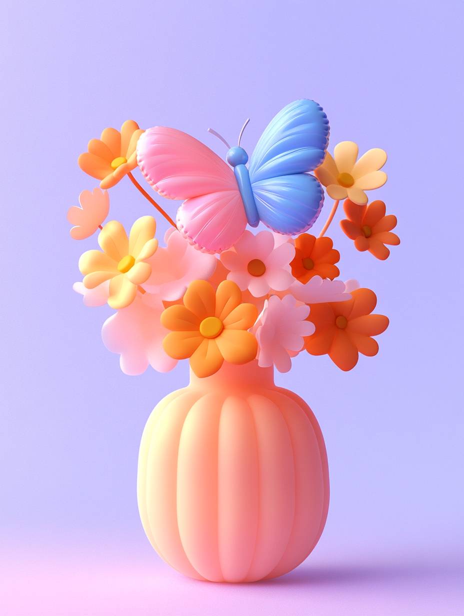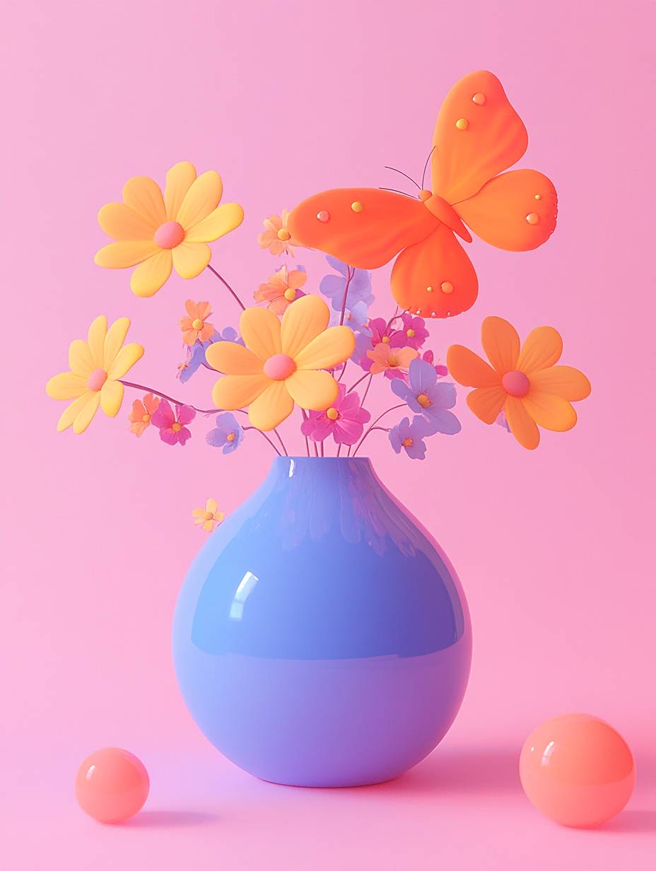 一個美麗的花瓶,裡面裝滿新鮮的花朵和一個充氣的蝴蝶,陽光明媚,天空晴朗,配有cinema4d渲染,3D效果,高解析度,極簡風格,高品質,夏季顏色,色彩碰撞,Y2K美學,平淡的低角度。