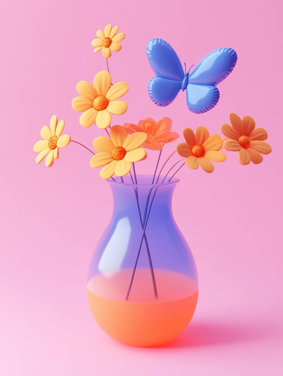 A beautiful vase with fresh flowers and an inflatable butterfly inside, the sun, clear sky, cinema4d, 3D, OC rendering, high-definition, minimalist, high-quality, summer colors, color clash, y2k aesthetic, blander, Low Angle --sref 3556861680 --ar 3:4 --s 250
