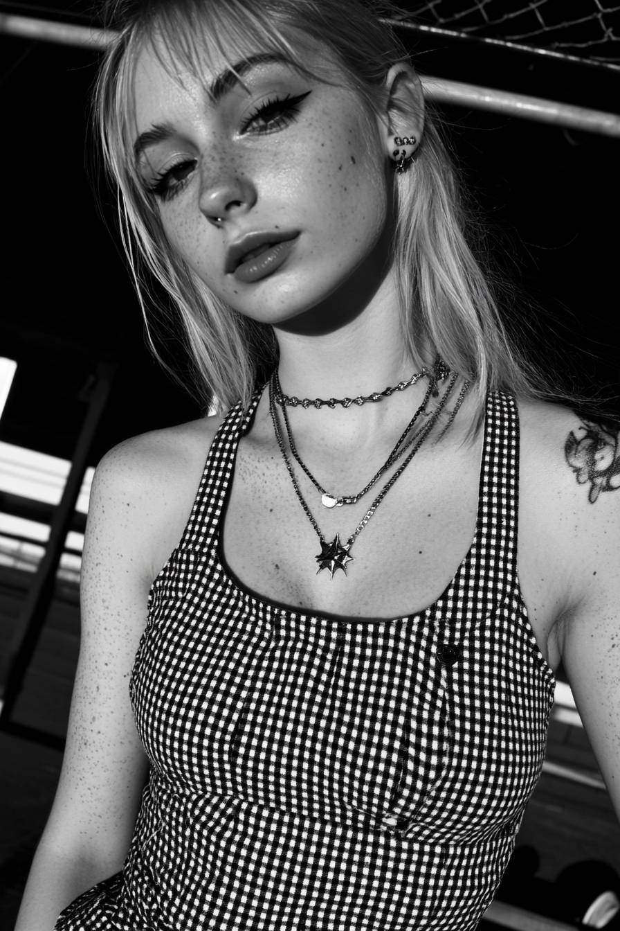 一個18歲的可愛日本女孩,長著直直的黑髮,以樂隊女孩的形象呈現,風格寫實。她的服裝採用黑白色調,搭配前衛的金屬風格妝容,增強了她年輕的魅力。她擺出獨特而充滿活力的姿勢,展現出自信和個性。背景是一個充滿活力的音樂會場景,有舞台燈光和音樂元素,增添了樂隊的氛圍。她的皮膚質感明顯,捕捉到真實人類皮膚的自然不規則和細節。這幅圖像是全身照,突顯了她時尚的外觀和熱鬧的背景。