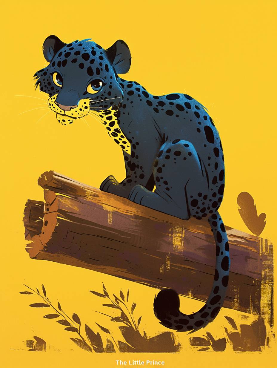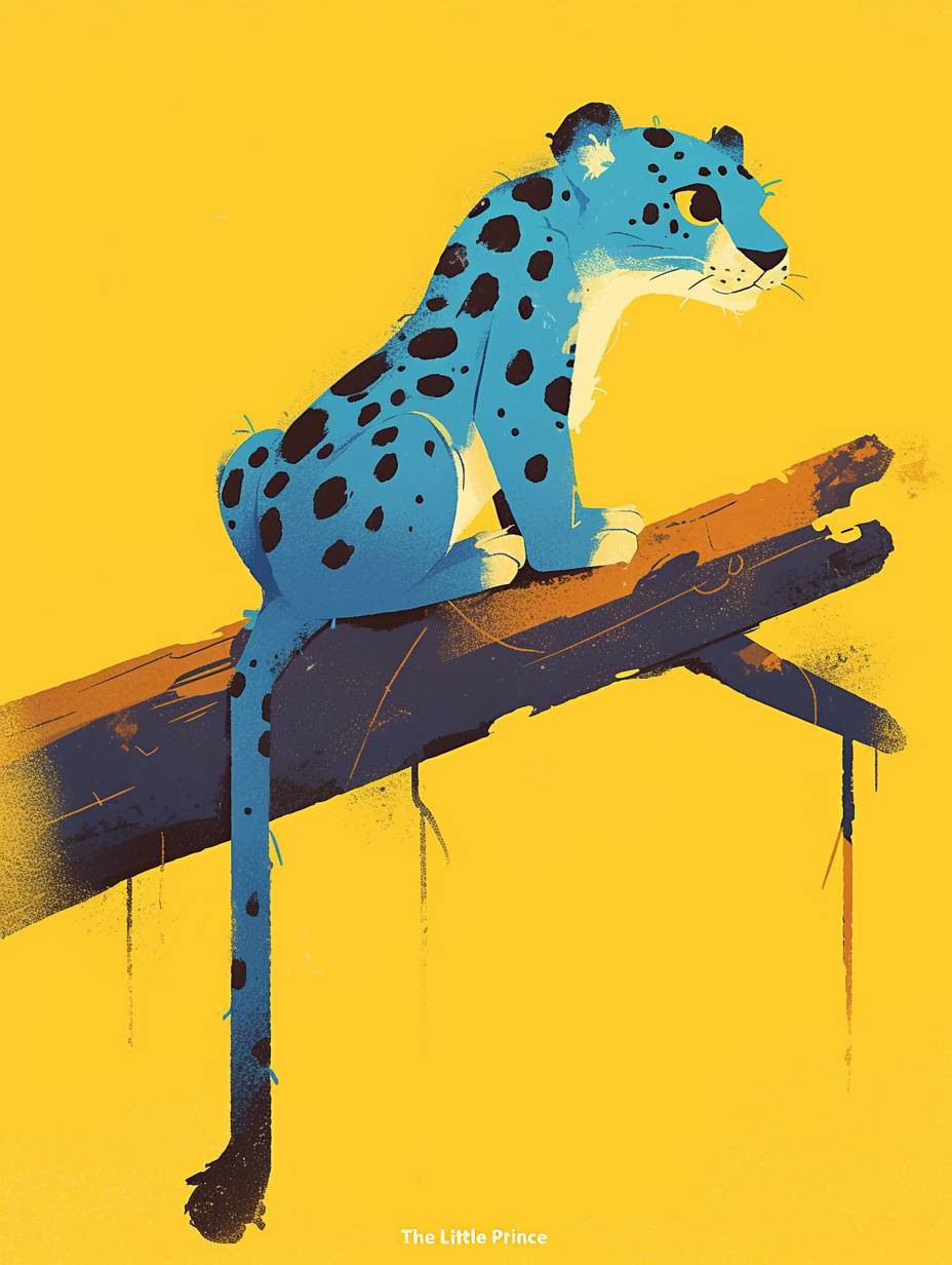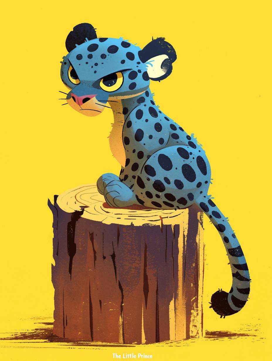 紙老虎,一隻藍色的 leopard,身上有黑色斑點,坐在一根原木的盡頭,背景為黃色。這是一幅卡通風格的插圖,風格類似於《小王子》,像是角色表或童書插圖,特寫視角。