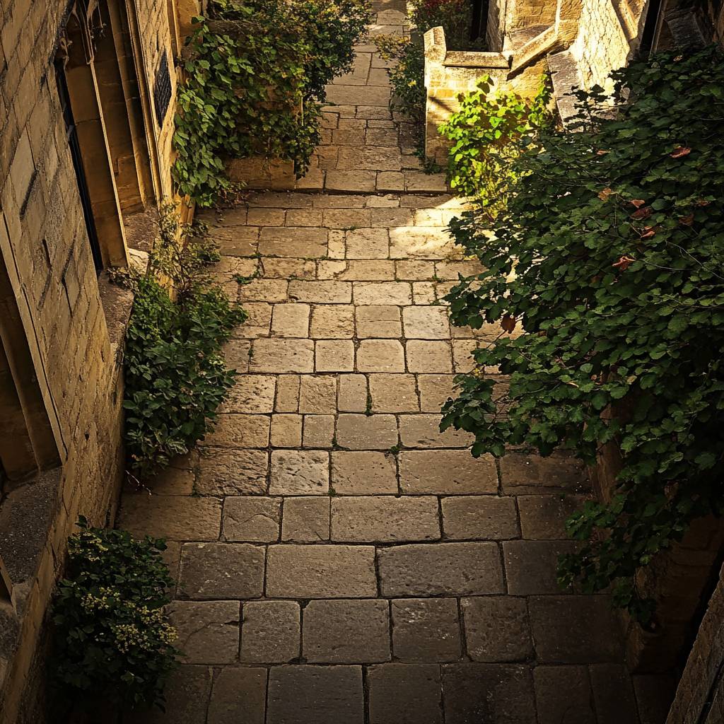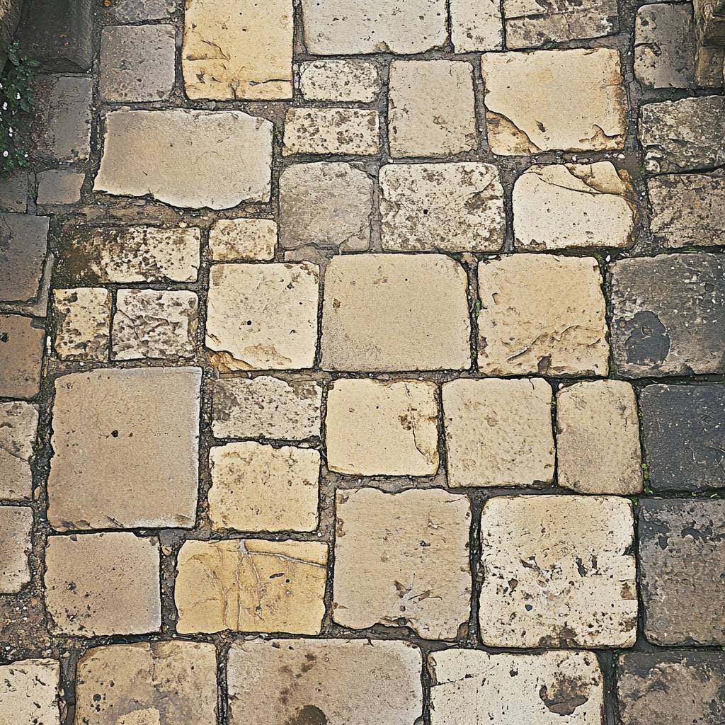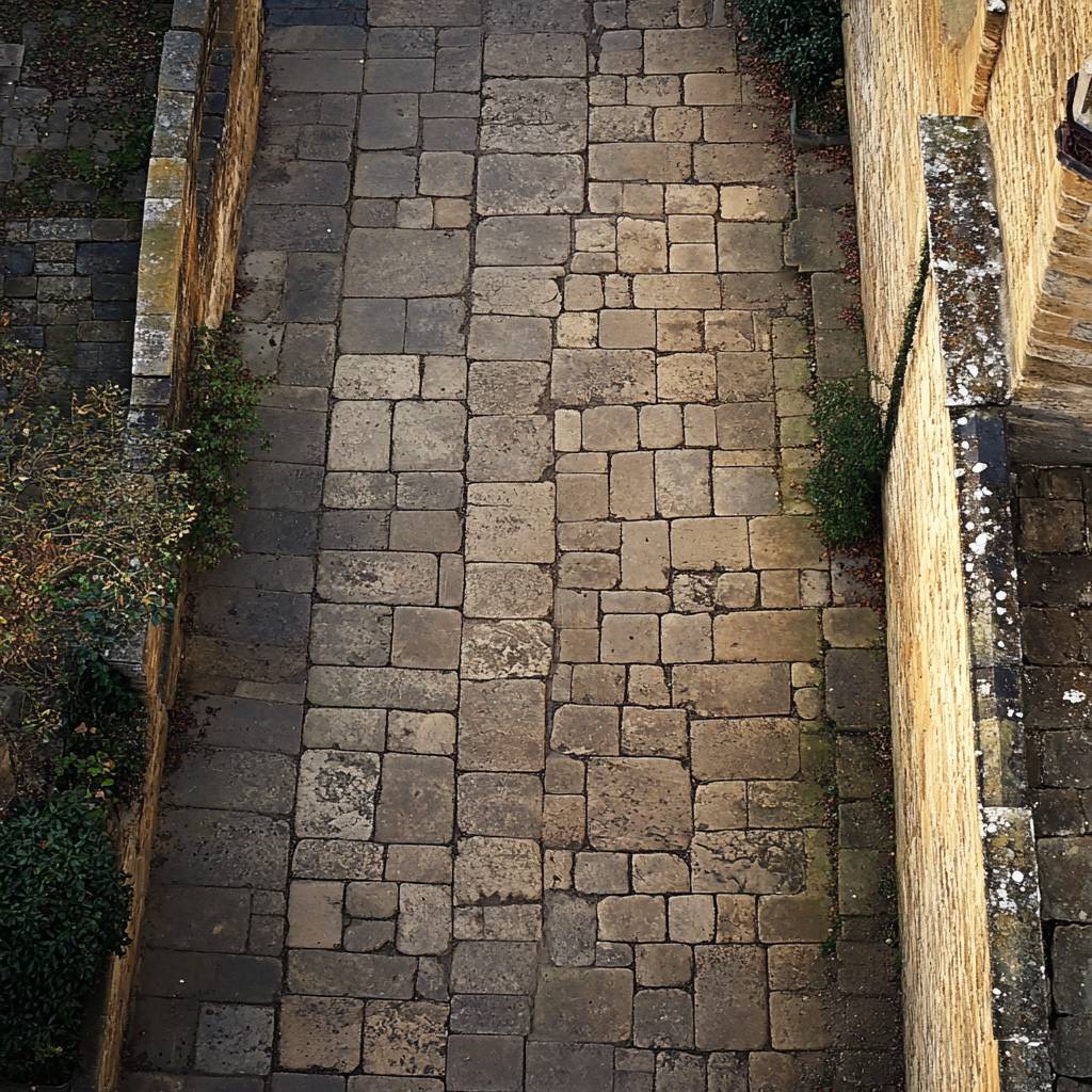 lat texture above view down of an old 15th century Oxford college pathway, warm 15th century Oxford cotswold stone, --v 6.1