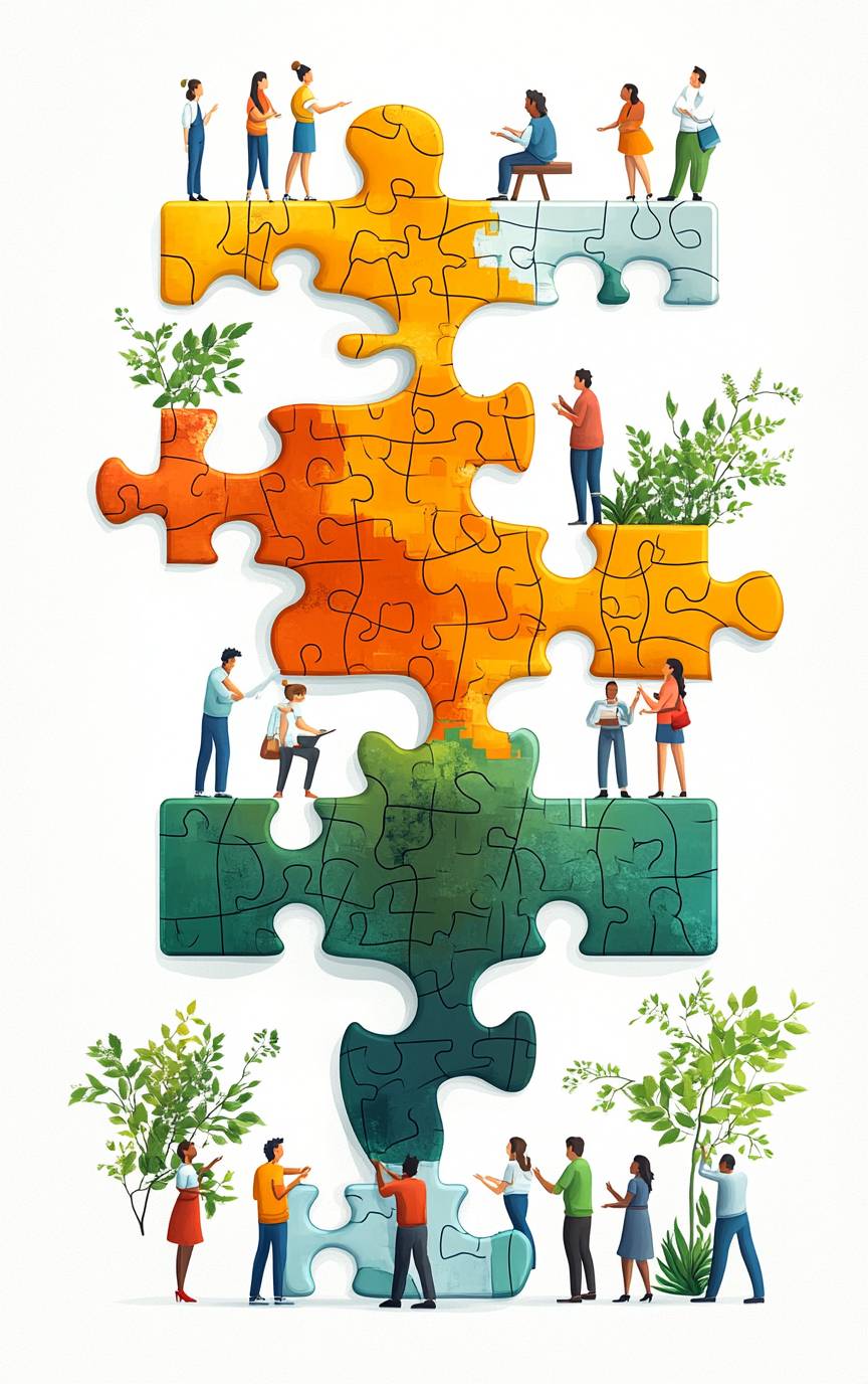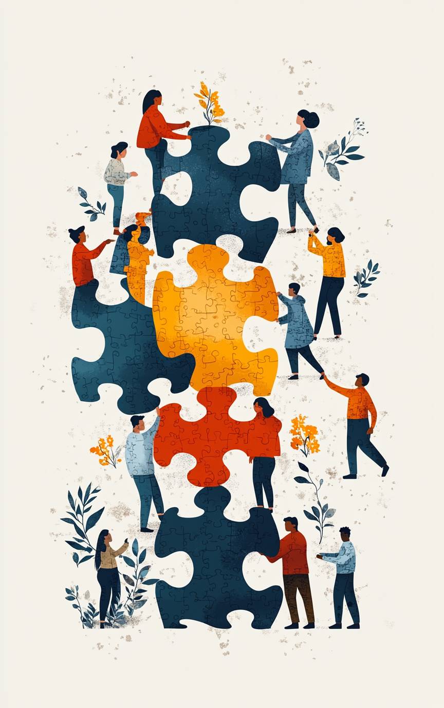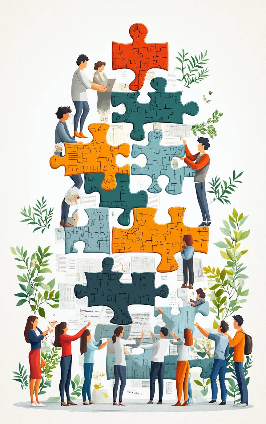 Collaboration and teamwork: a flat vector illustration with people connecting puzzle pieces together, creating an idea or project on a white background for a business concept design. A flat-style cartoon icon of diverse men and women working in a group to make a successful company, in the style of pushing a big jigsaw piece to the center. --ar 5:8 --stylize 750 --v 6.1