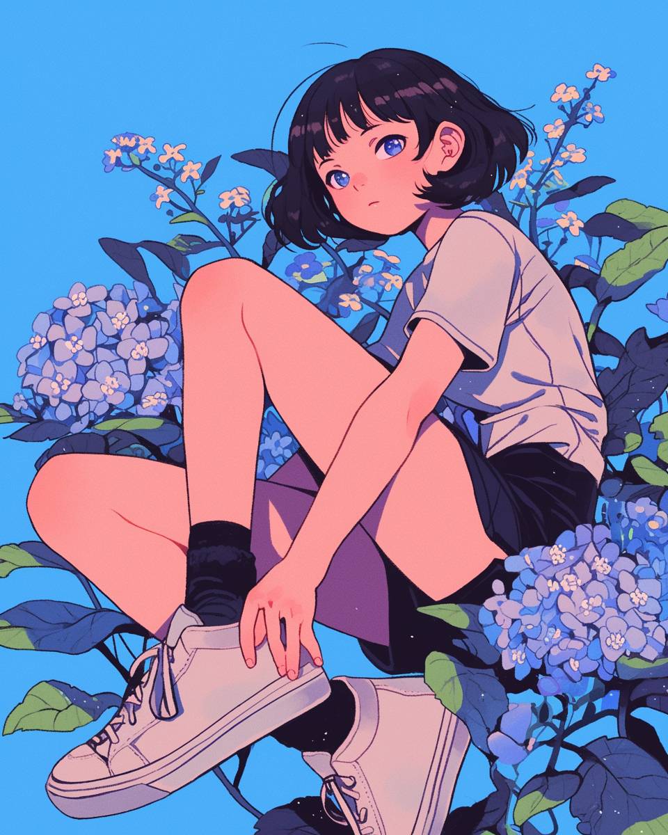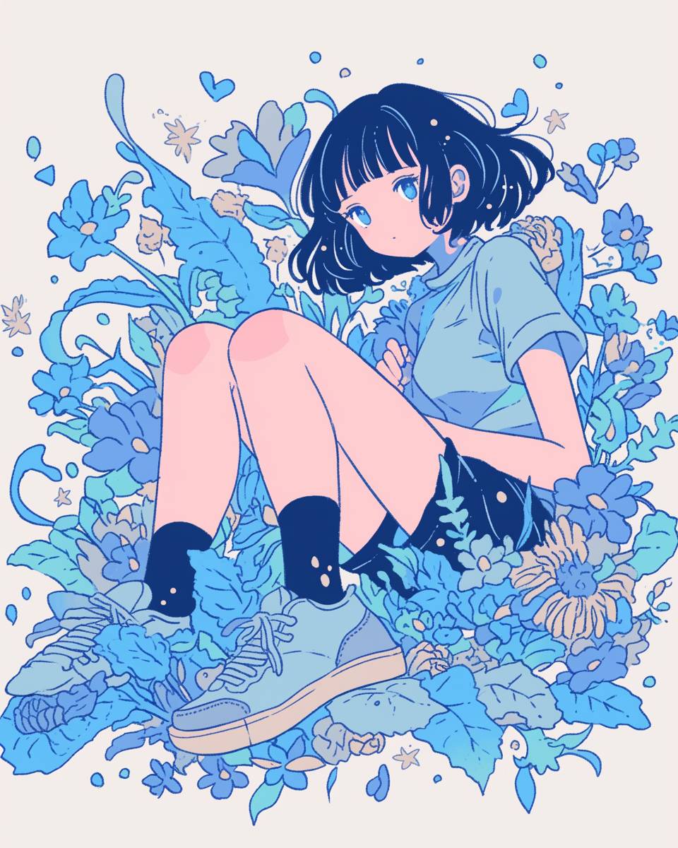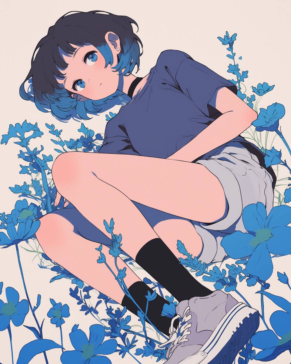 藝術,可愛,一個穿着簡單衣服的動漫可愛女孩,躺在一朵小藍花上,藍色粉 pastel 色調,短髮,日本漫畫風格的詳細插圖,全身鏡頭,穿著黑色襪子,淺灰色運動鞋,復古美學,特寫鏡頭,動態角度,粗線條,鮮豔的顏色,高對比度,俏皮的氛圍。