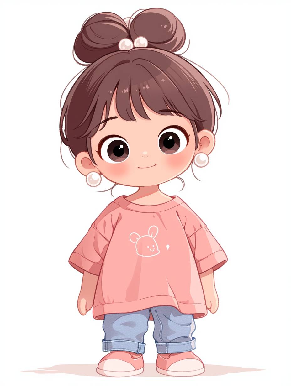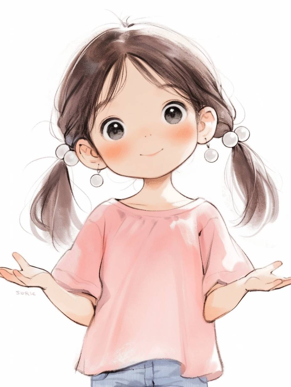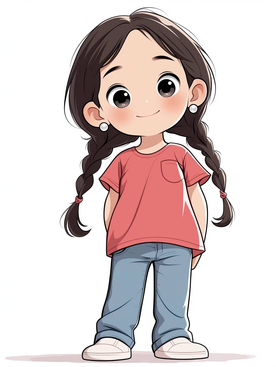 一個五歲可愛的中國女孩, 大眼睛,熱情的頭髮,美麗的珍珠耳環,前面和半側,粉紅色的衣服,牛仔褲,幸福,昆廷·布雷克風格,異想天開的卡通風格,完整的身體,充滿幻想和奇思妙想,矢量,漫畫藝術,索菲·皮赫,白色背景,馬克筆插圖,簡單的細節,極簡衣服,幸福,昆廷·布雷克風格,異想天開的卡通風格,充滿幻想和奇思妙想,矢量,鮮豔的顏色,漫畫藝術,索菲·皮赫,簡單背景,馬克筆插圖,簡單的細節,極簡主義