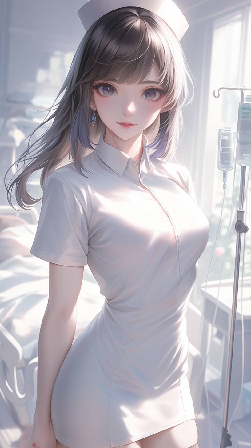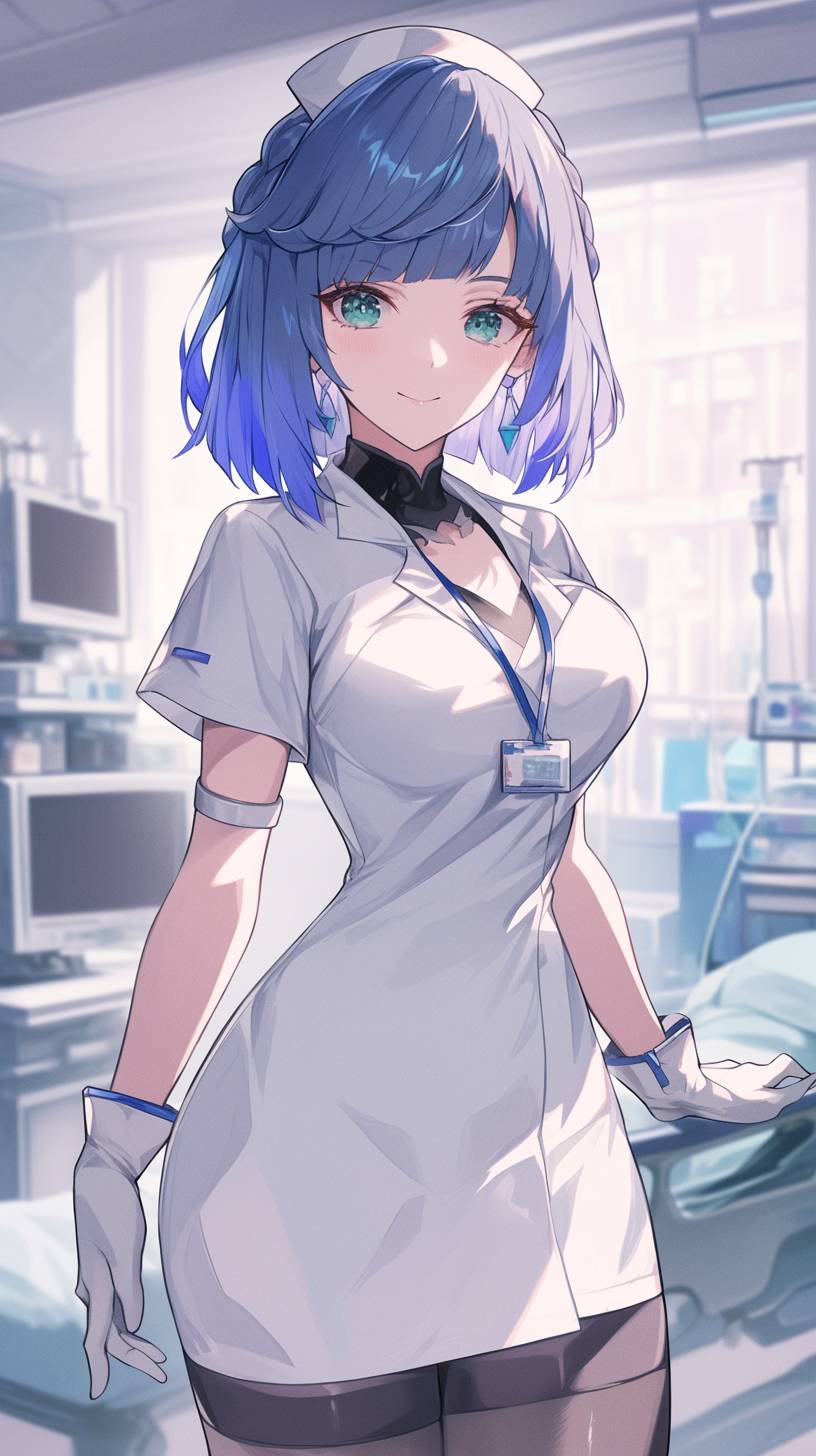 來自《原神》的夜蘭,一位穿著酷炫護士制服的美麗女孩,站在一個光線明亮的醫院房間裡,面帶溫柔的微笑,具有關懷的舉止,描繪風格現實而專業。