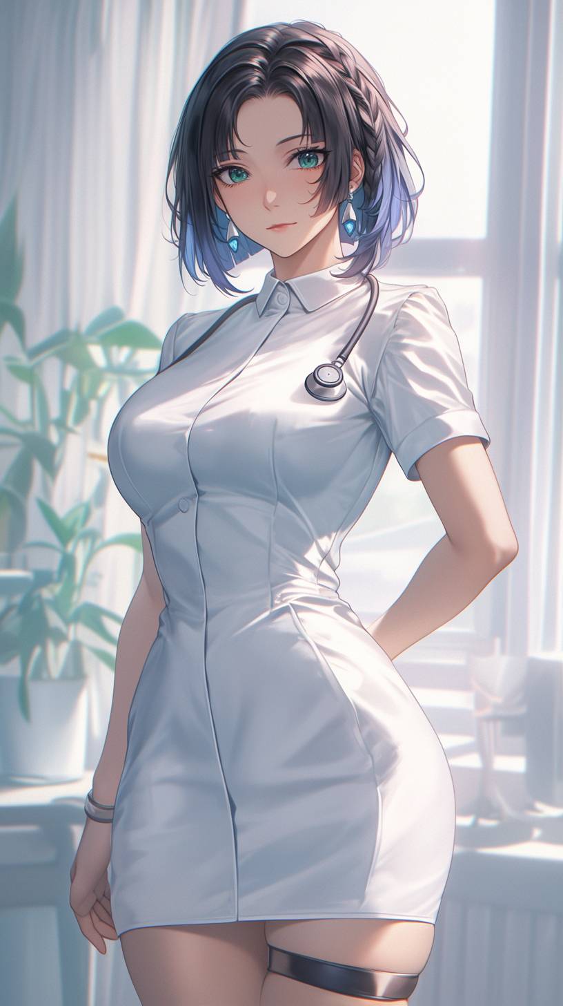 Yelan from Genshin Impact,a beautiful girl dressed in a cool nurse uniform, standing in a well-lit hospital room, with a gentle smile and caring demeanor, depicted in a realistic and professional style --ar 9:16 --stylize 250 --niji 6