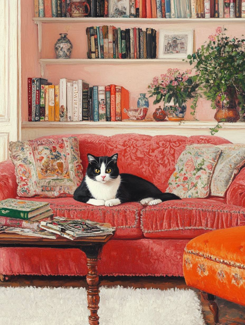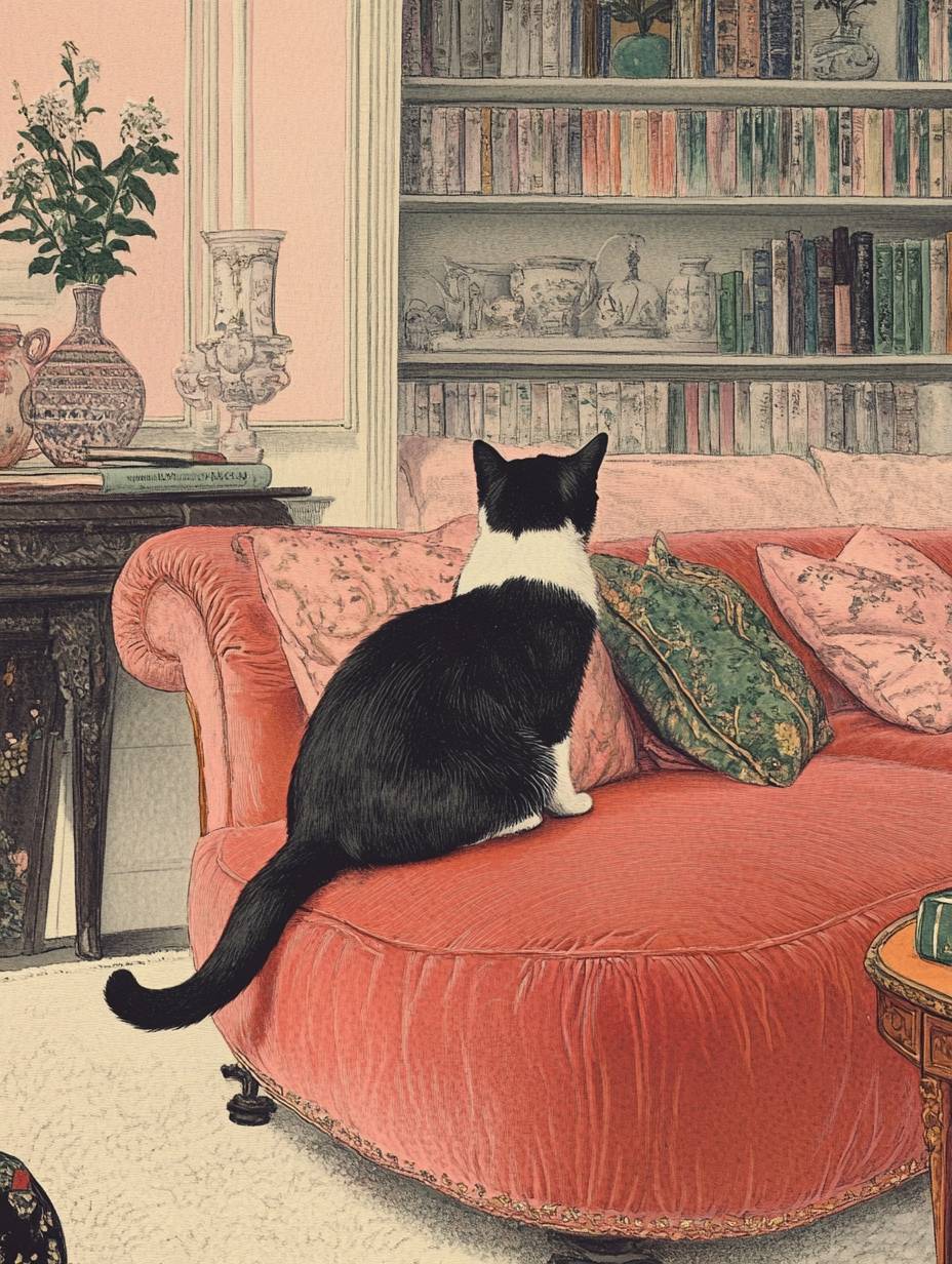 古斯達夫·多雷,一隻黑白相間的貓坐在客廳的粉紅色天鵝絨沙發上,前、側、後視圖,四周環繞著奶油色和淺粉色的牆壁裝飾。沙發下鋪著一塊白色地毯,旁邊有一個橙色的足凳和柔軟的靠墊。咖啡桌上放著書籍,柔軟的靠墊上放著一個花瓶,為客廳增添了一絲幻想氛圍。書架上放著書籍、雜誌、植物和花卉。