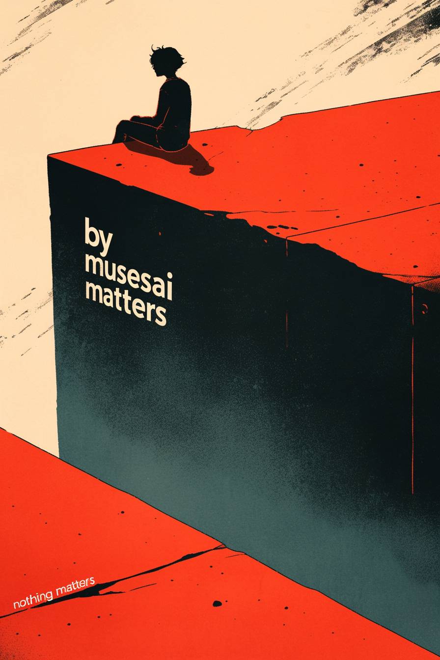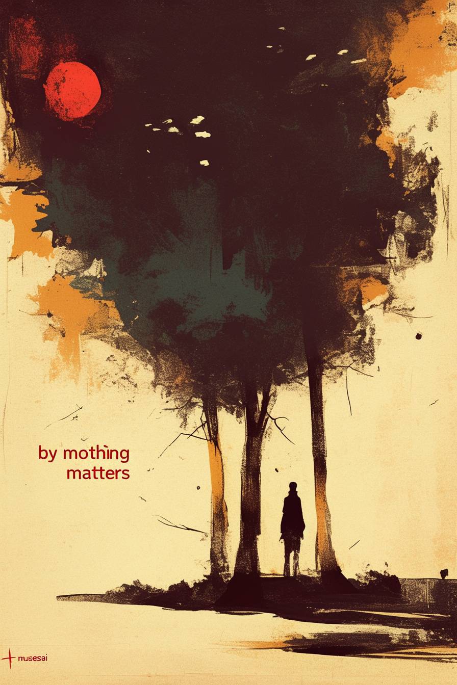 海報上寫著「by musesai」,下面有一個悲傷的形象。旁邊有另一句名言「沒有甚麼重要」,下面是一個非常快樂的形象。海報藝術作品,復古藝術風格,黑暗氣氛的海報,簡單而極簡,海報上帶有白色噪音顆粒。