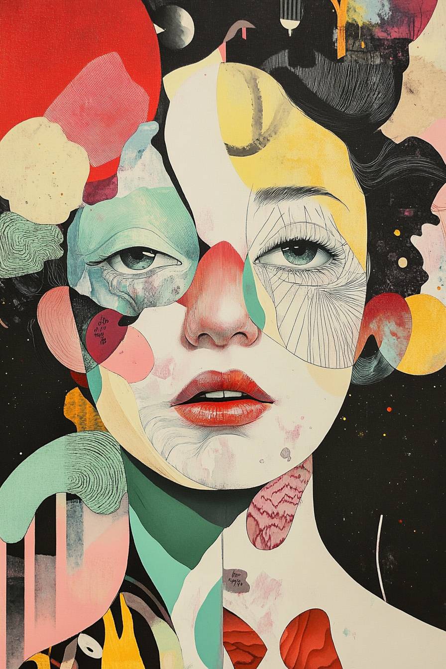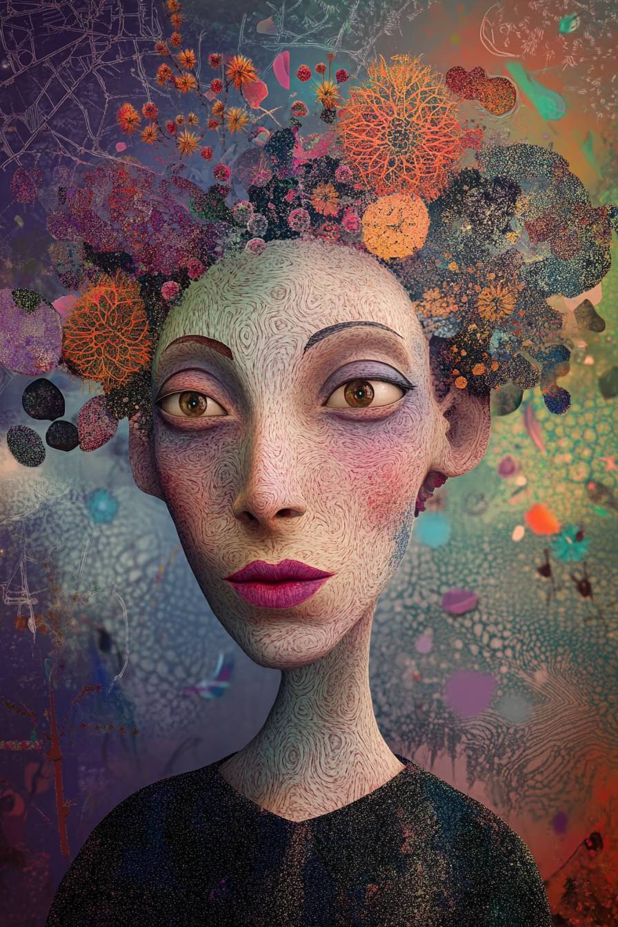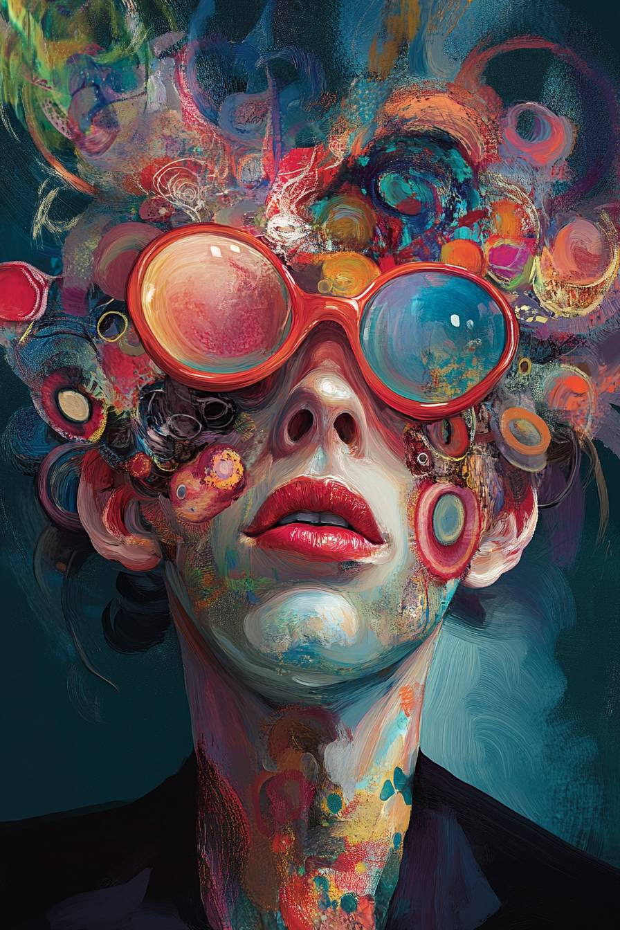 一幅充滿奇幻的[SUBJECT]肖像,採用量子波普超現實主義風格,特點是誇張的特徵和[COLOR1]、[COLOR2]的色彩調色板。